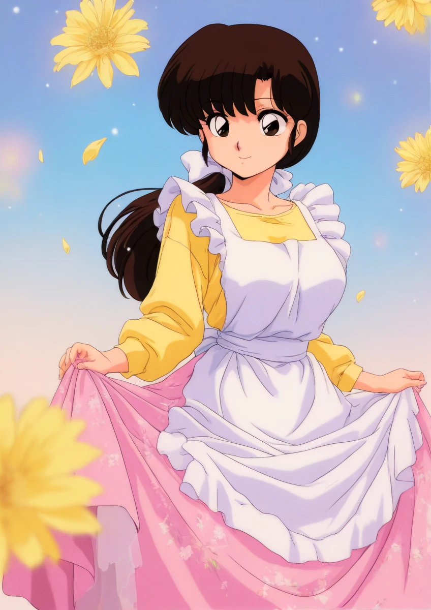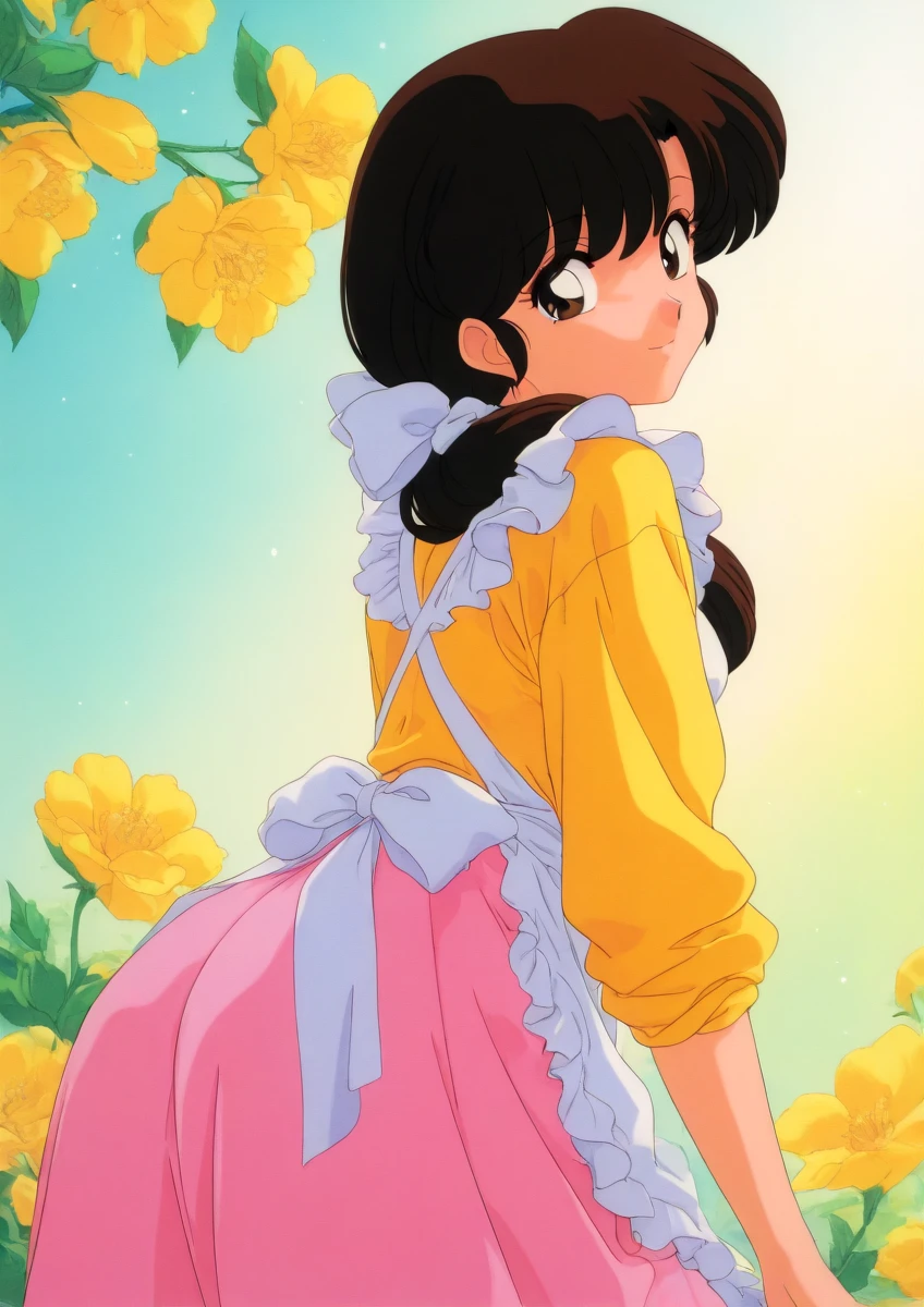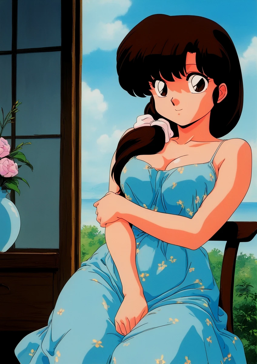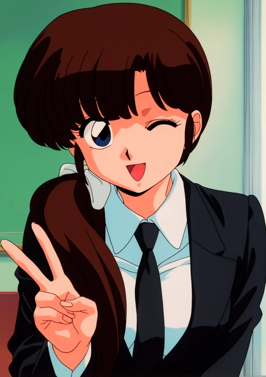 kasumi_ranma_99, 1girl, 90s anime style, long brown hair, hair over the shoulder, brown eyes,