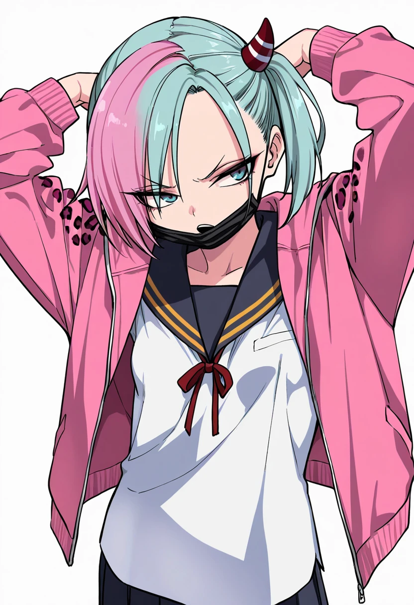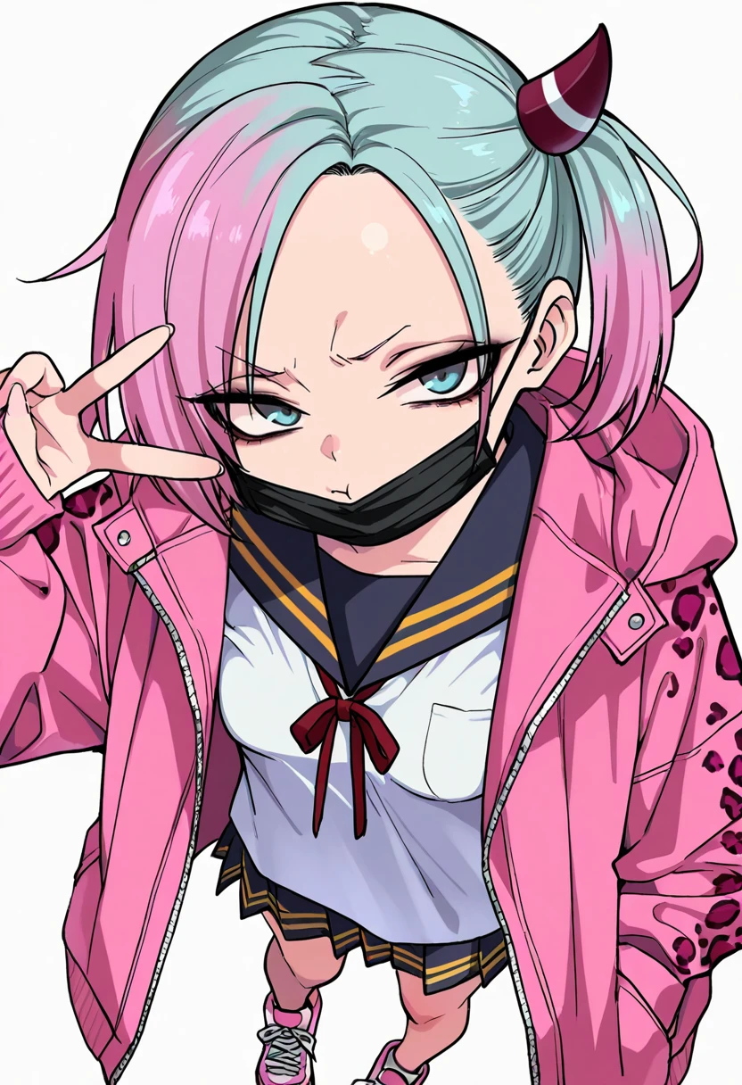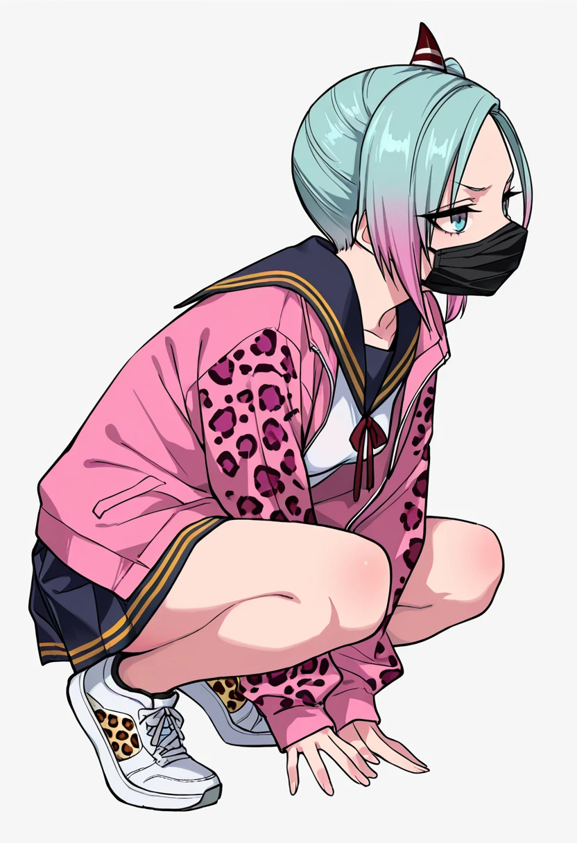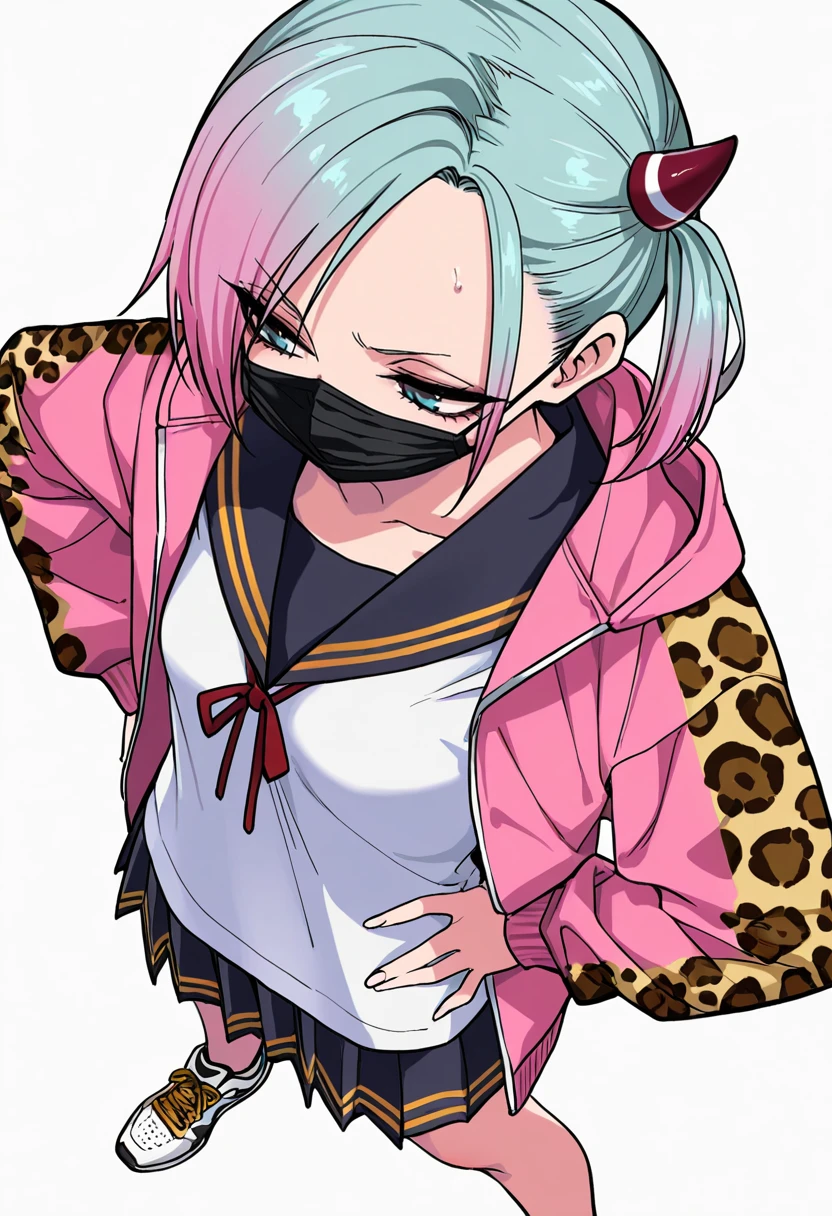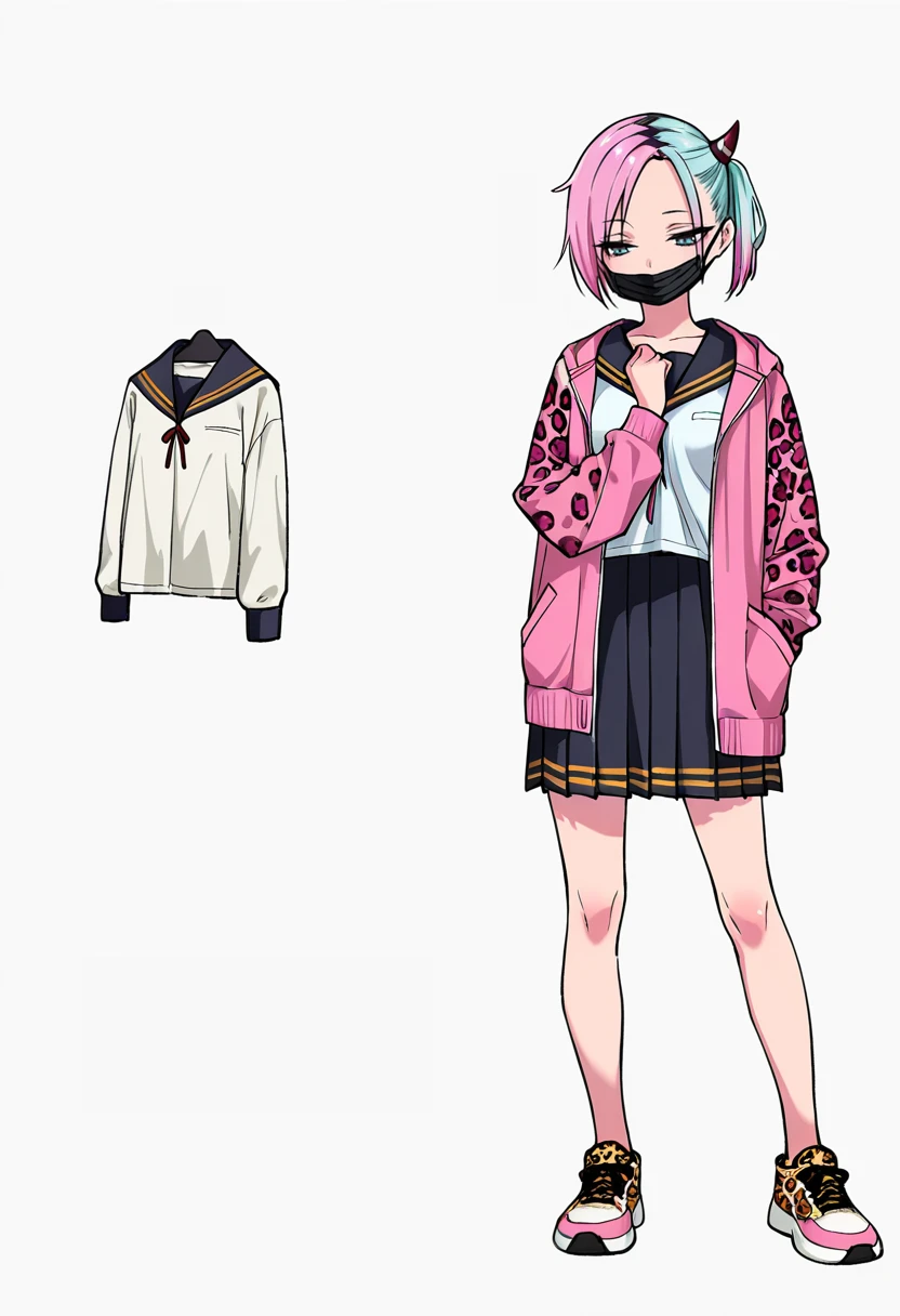 serafuku,pink jacket, long sleeves,white shirt,open jacket, leopard print,black mouth mask,sneakers,Details
