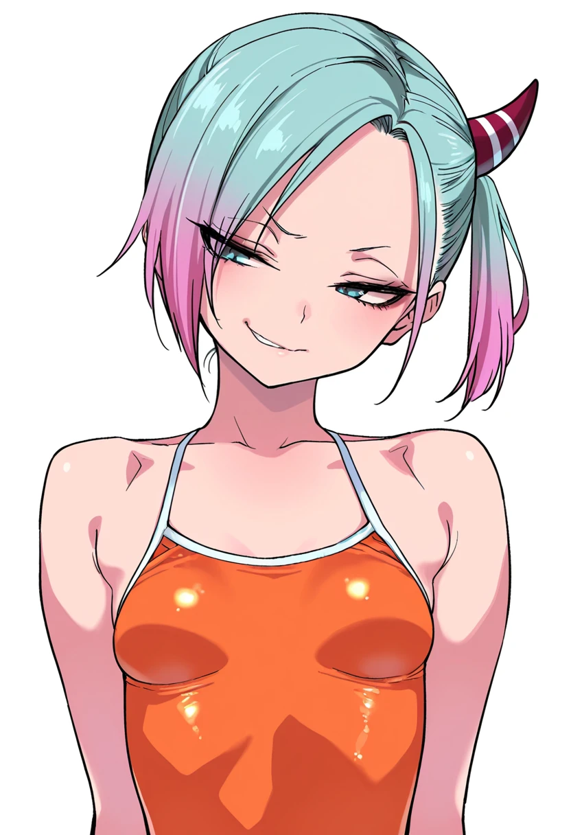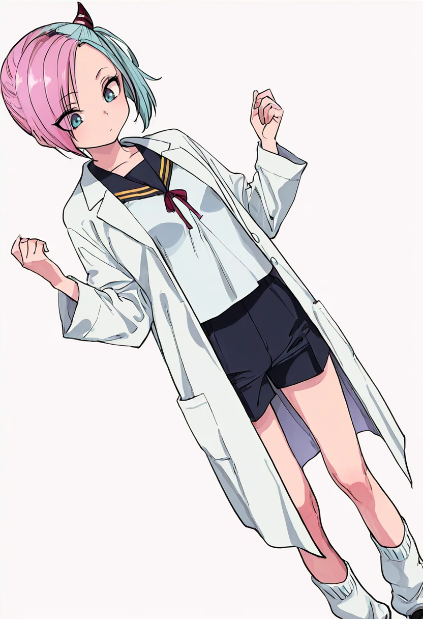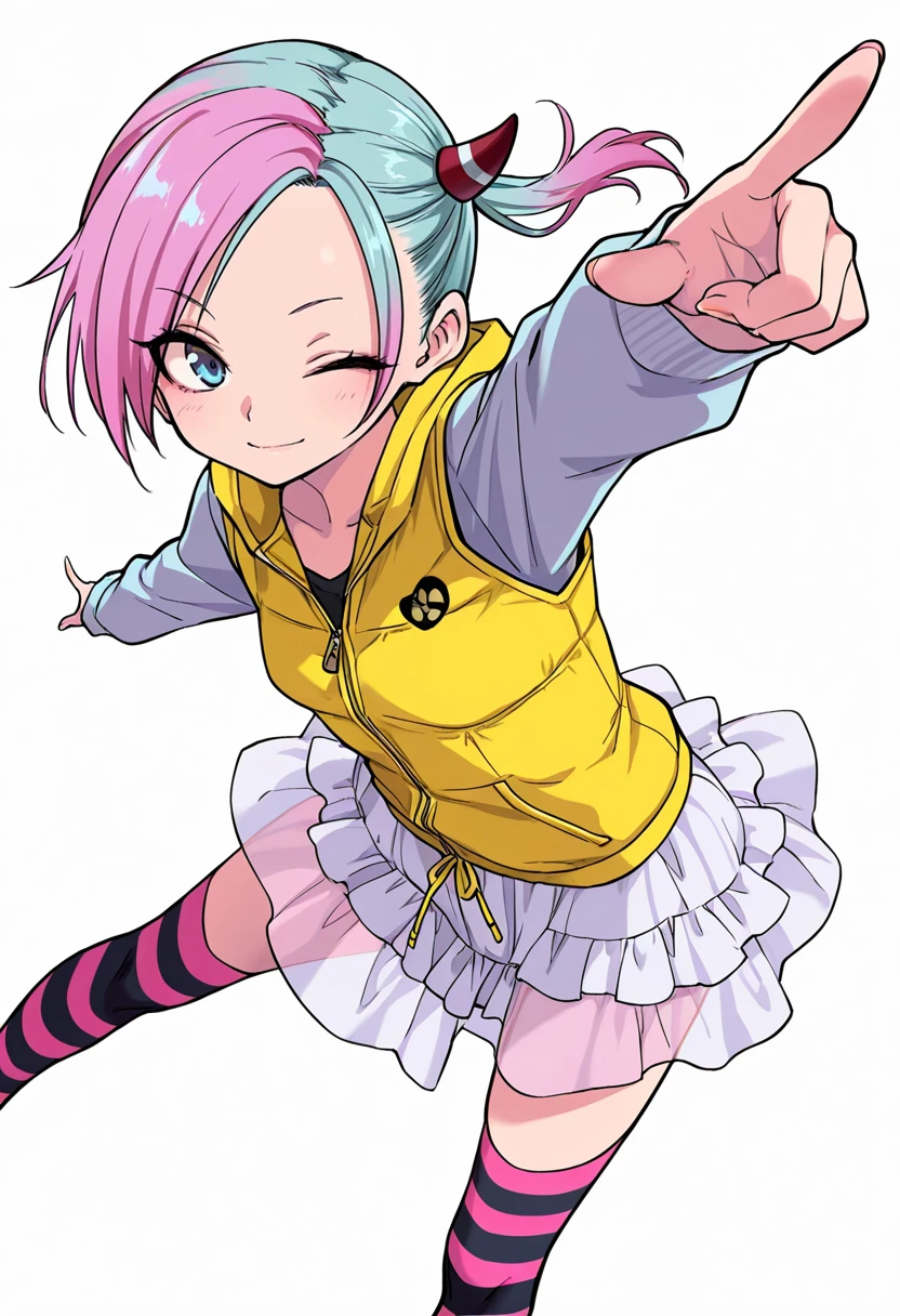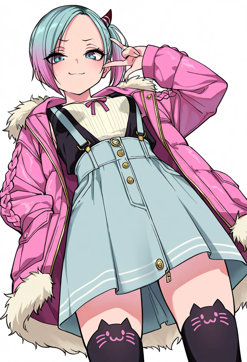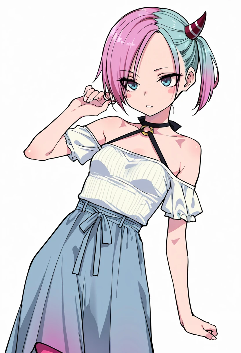 sagara_cnr, 1girl,pink hair,blue eyes, short hair, small breasts, side ponytail, (aqua hair:1.1), two-tone hair,horn,👗Signature Outfit