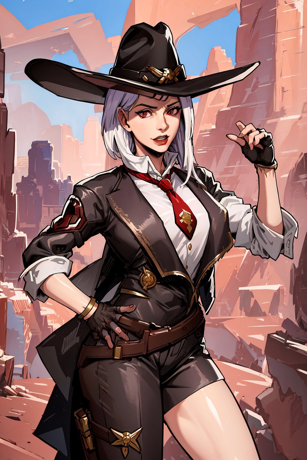Outfit - cowboy hat, necktie, suit, jacket, gloves, shoulder amor, high heels