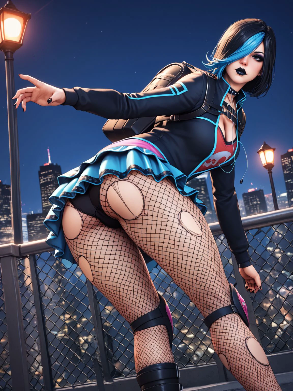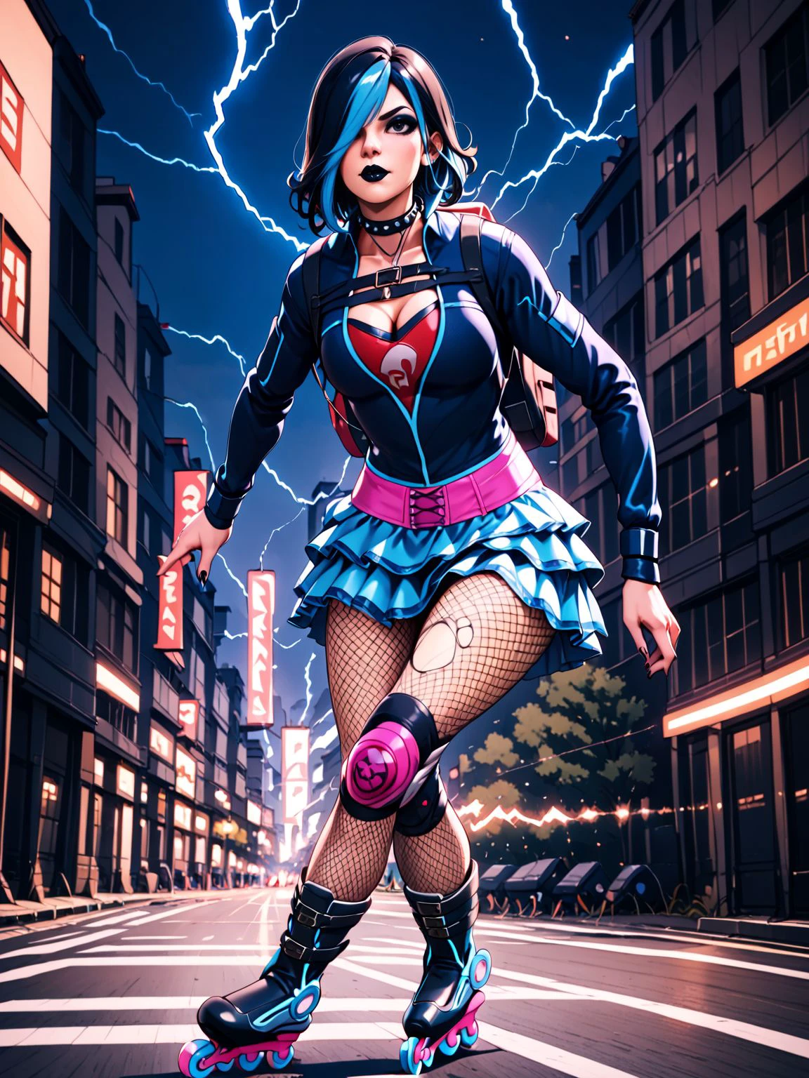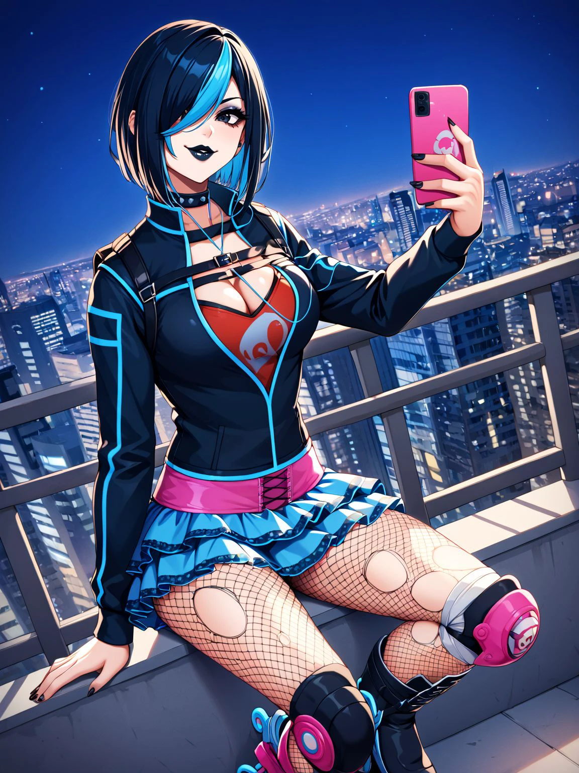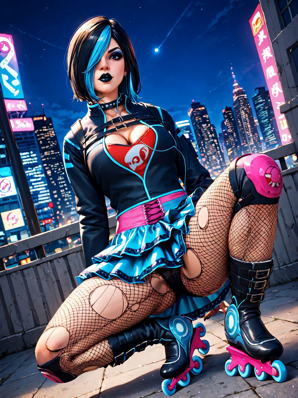 cleavage,cleavage cutout,earphones,choker,collar,studded collar,jacket,black jacket,long sleeves,backpack,nail polish,black nails,single knee pad,skirt,miniskirt,layered skirt,frilled skirt,blue skirt,fishnets,fishnet pantyhose,torn pantyhose,boots,belt boots,black footwear,roller skates,inline skates