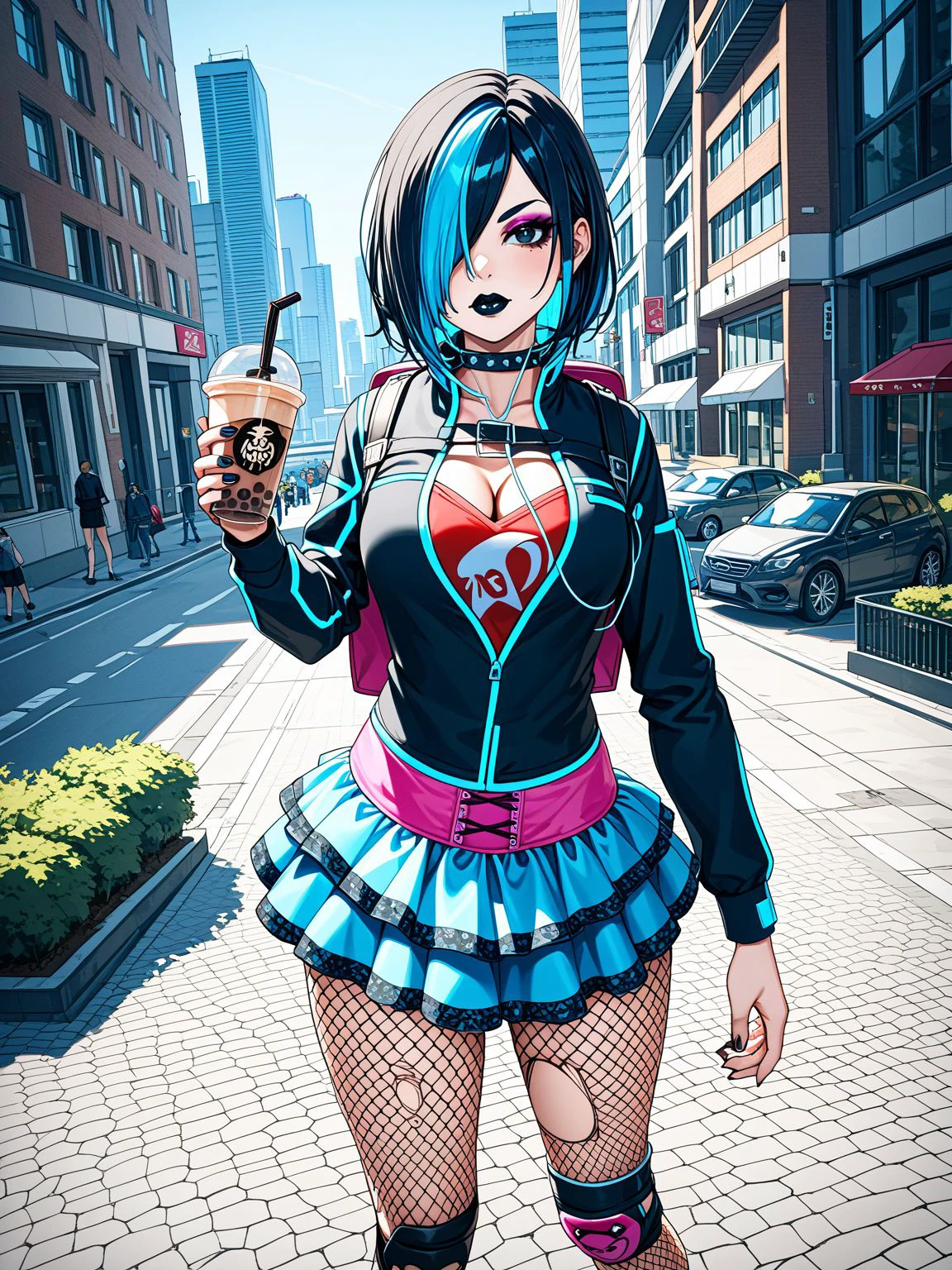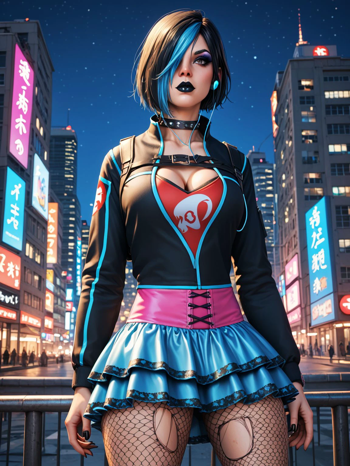 multicolored hair,blue hair,black hair,medium hair,two-tone hair,streaked hair,hair over one eye,makeup,black eyes,eyeshadow,black lips,lipstick,breasts,medium breasts