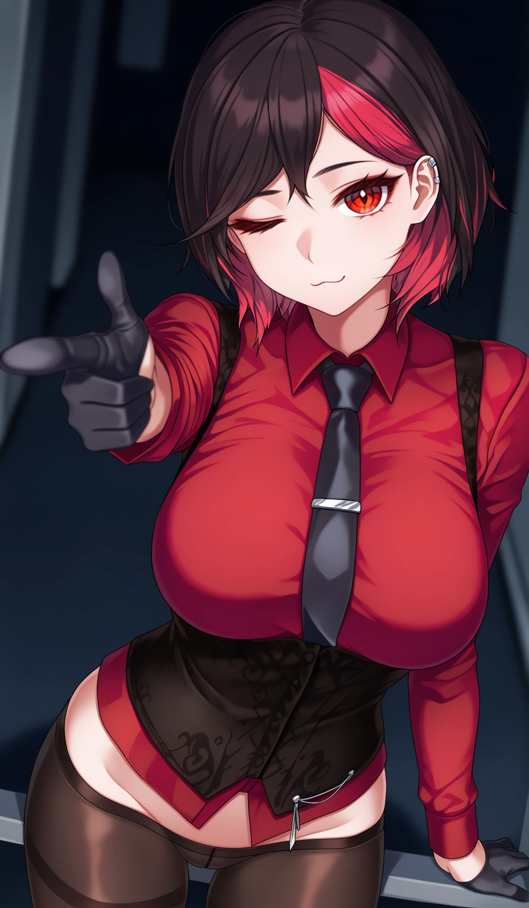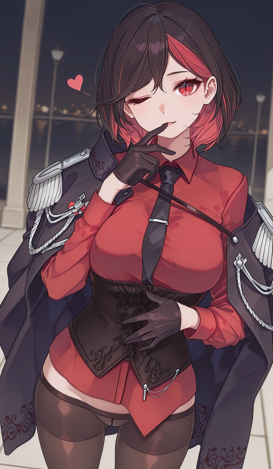 Additional prompts to specify character's appearance if necessery: short hair, multicolored hair, red eyes, slit pupils, large breasts, corset, red shirt, black necktie, necktie between breasts, taut shirt, lowleg pantyhose, thighband pantyhose, butt crack, groin, boots, half gloves