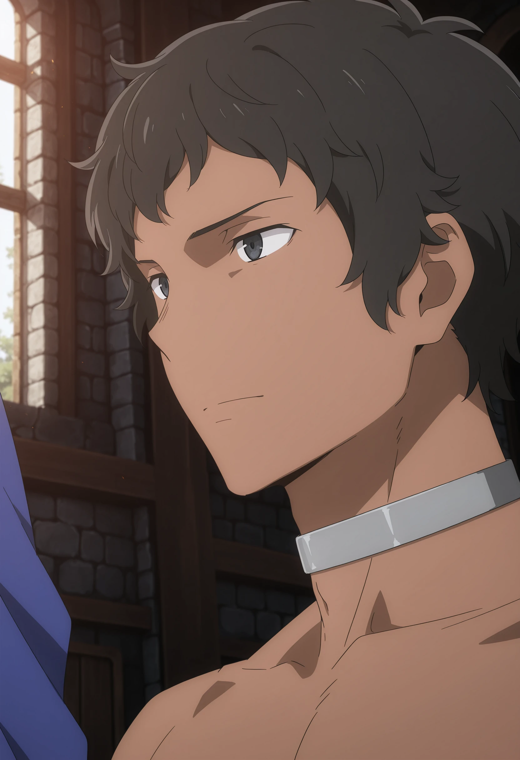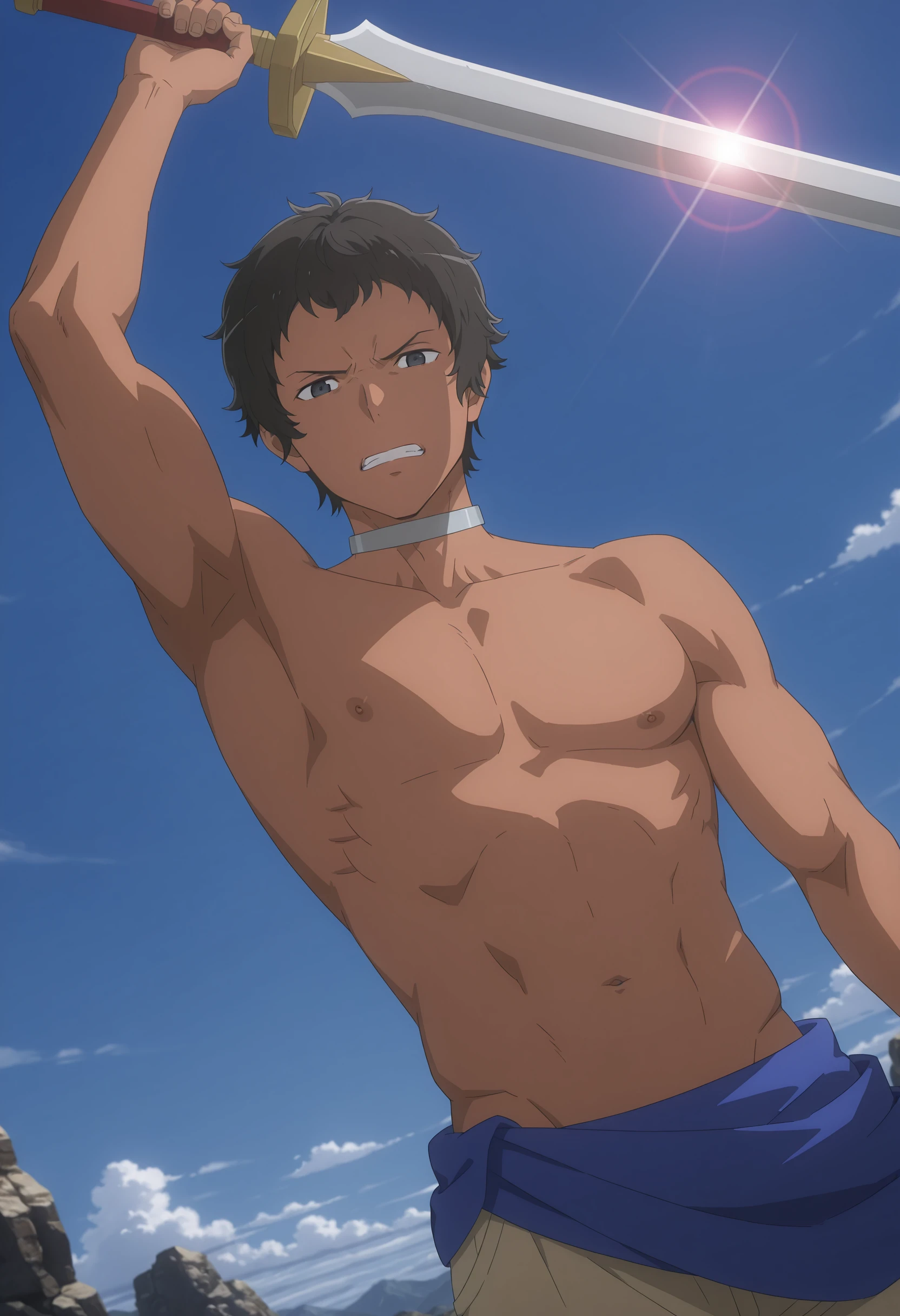 black hair, black eyes, brown skin, choker necklace, blue cloth wrapped around waist, beige pants