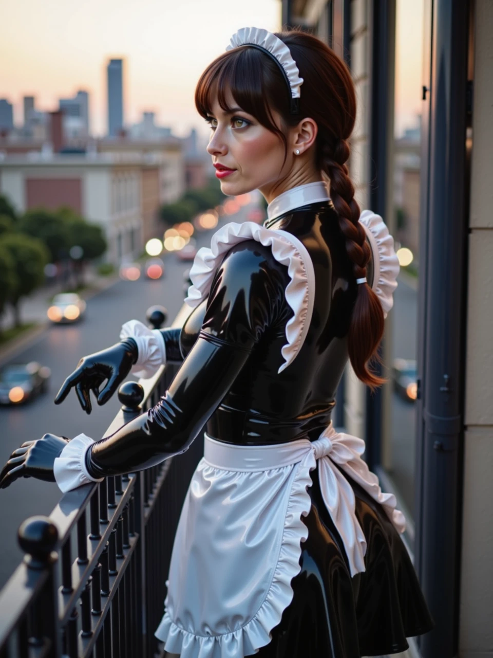 To trigger the Latex French Maid effect, simply use the phrase "wearing a latex french maid dress with black latex stockings, black gloves and a white latex ruffled wristband." This phrase ensures the LoRA brings out the full detail of the outfit in your creations.