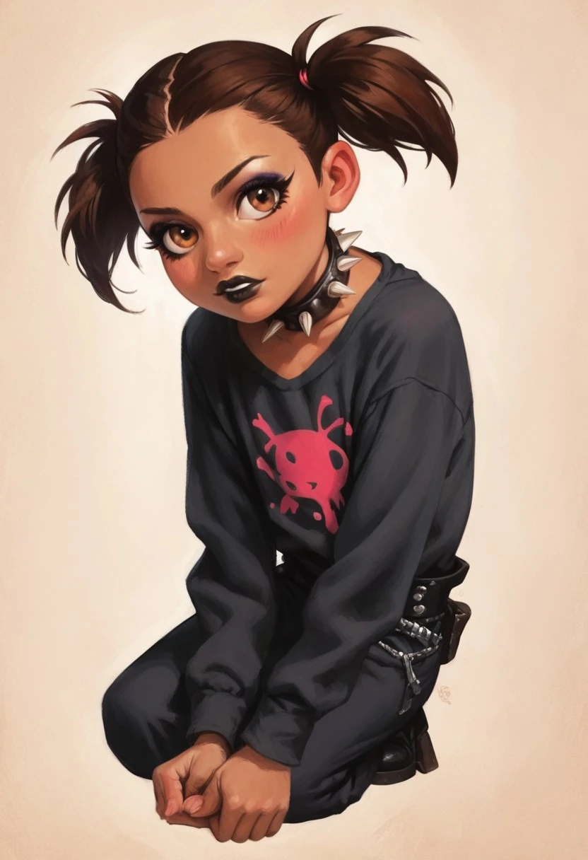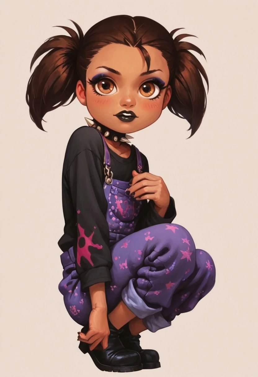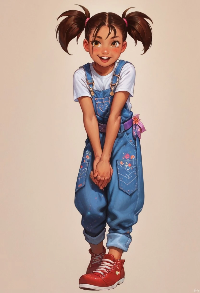 Manon Chamack, tan skin female, brown hair, hair pulled back into two ponytails, two ponytails, golden-brown eyes, two upper front buck teeth, white t-shirt, rolled-up sleeves, purple denim overalls with flower pattern , purple belt around the waist, red shoes with black soles,