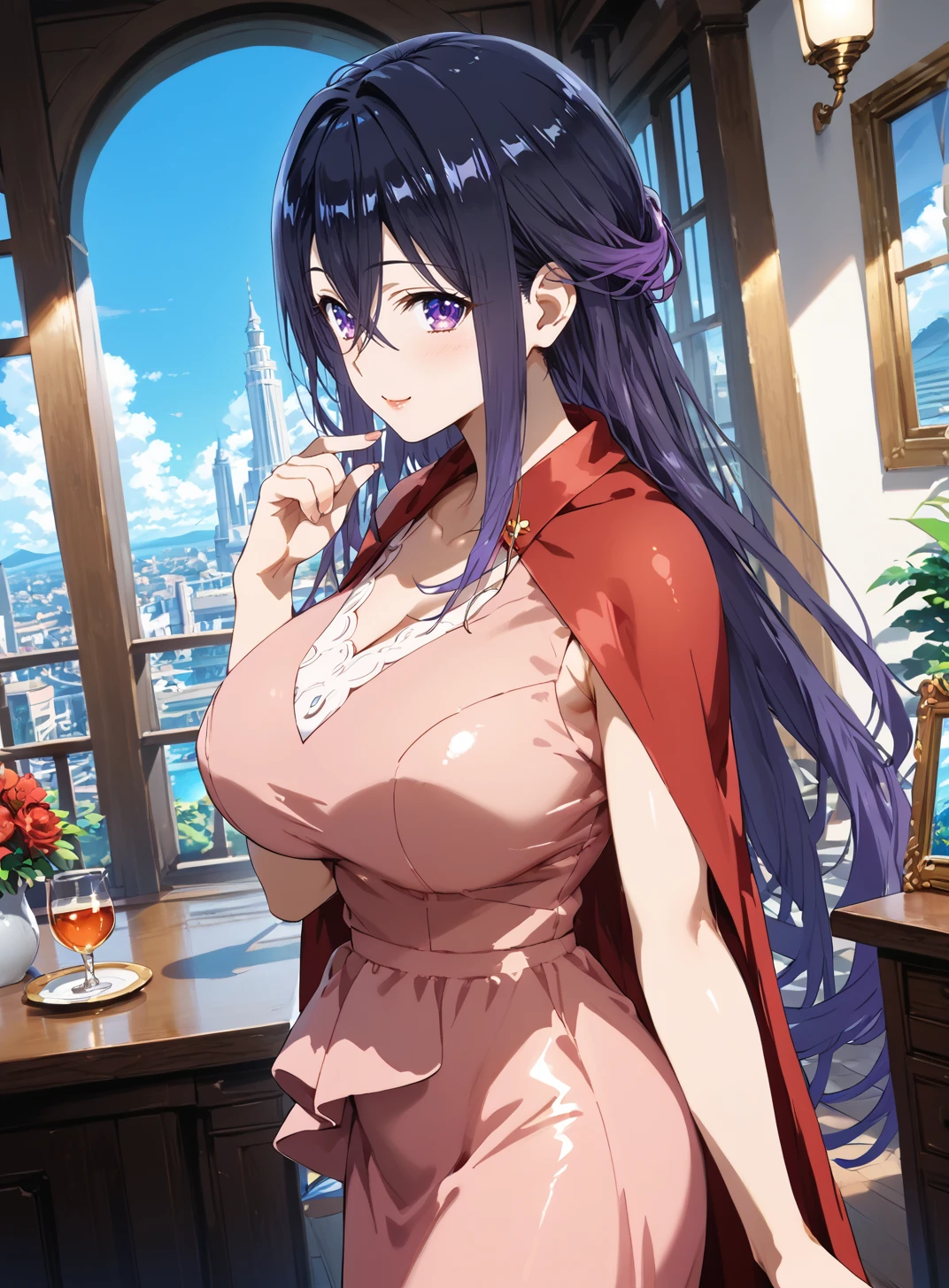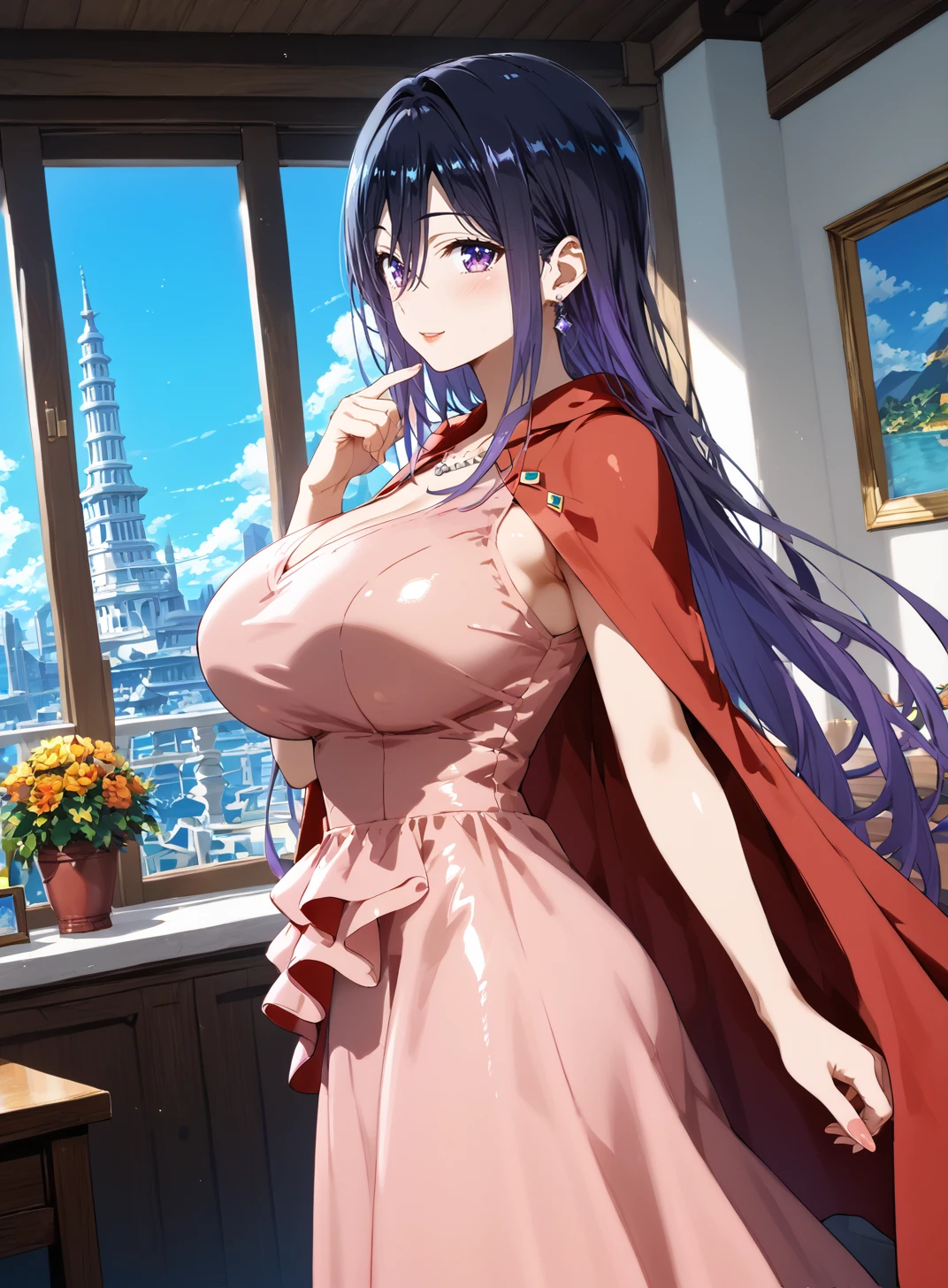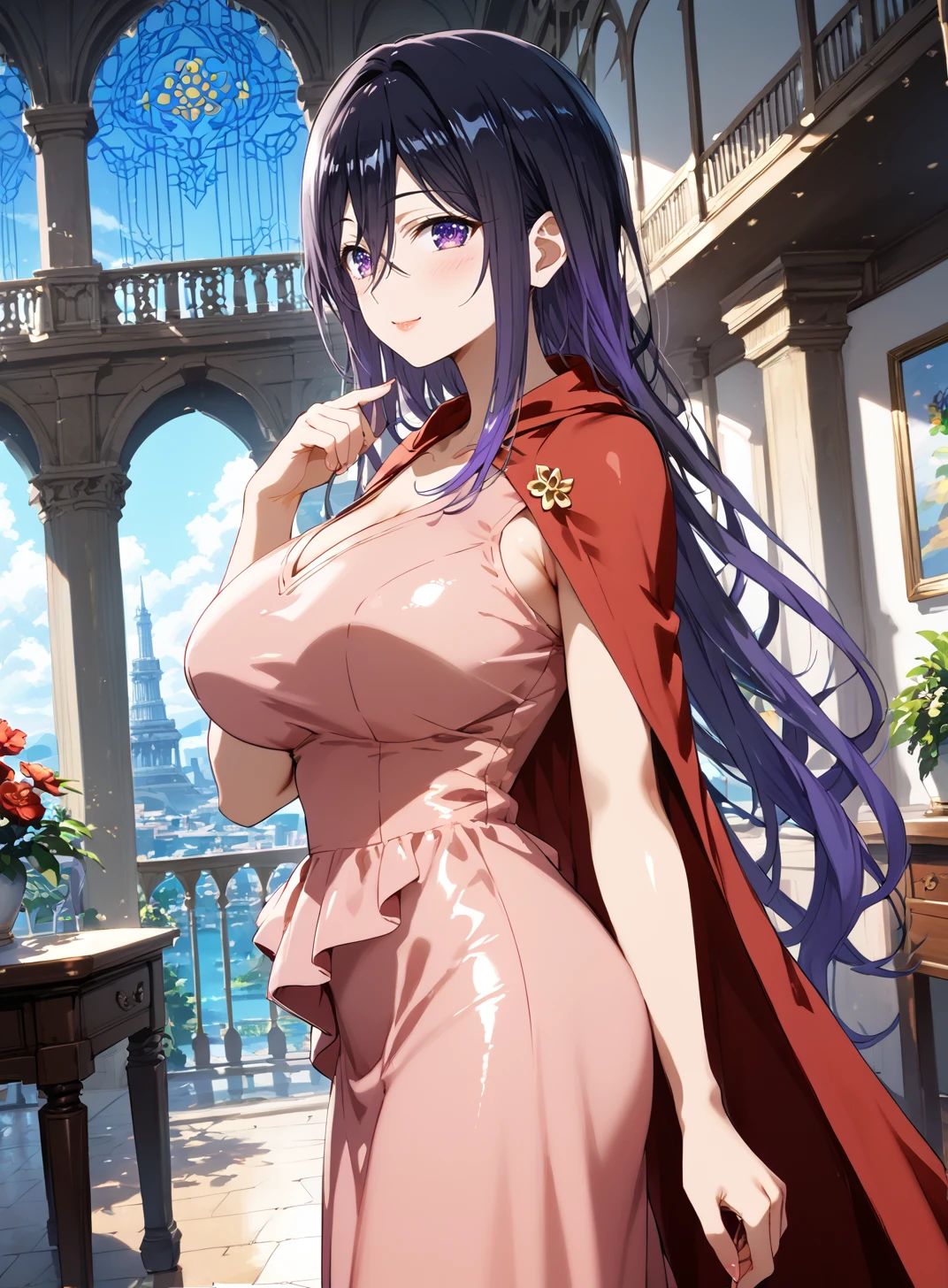yukine araki, gradient hair, purple eyes, very long hair, hair between eyes, red cape, pink dress