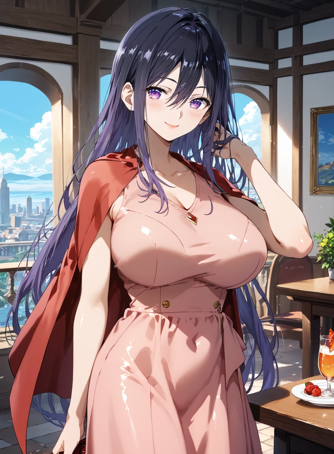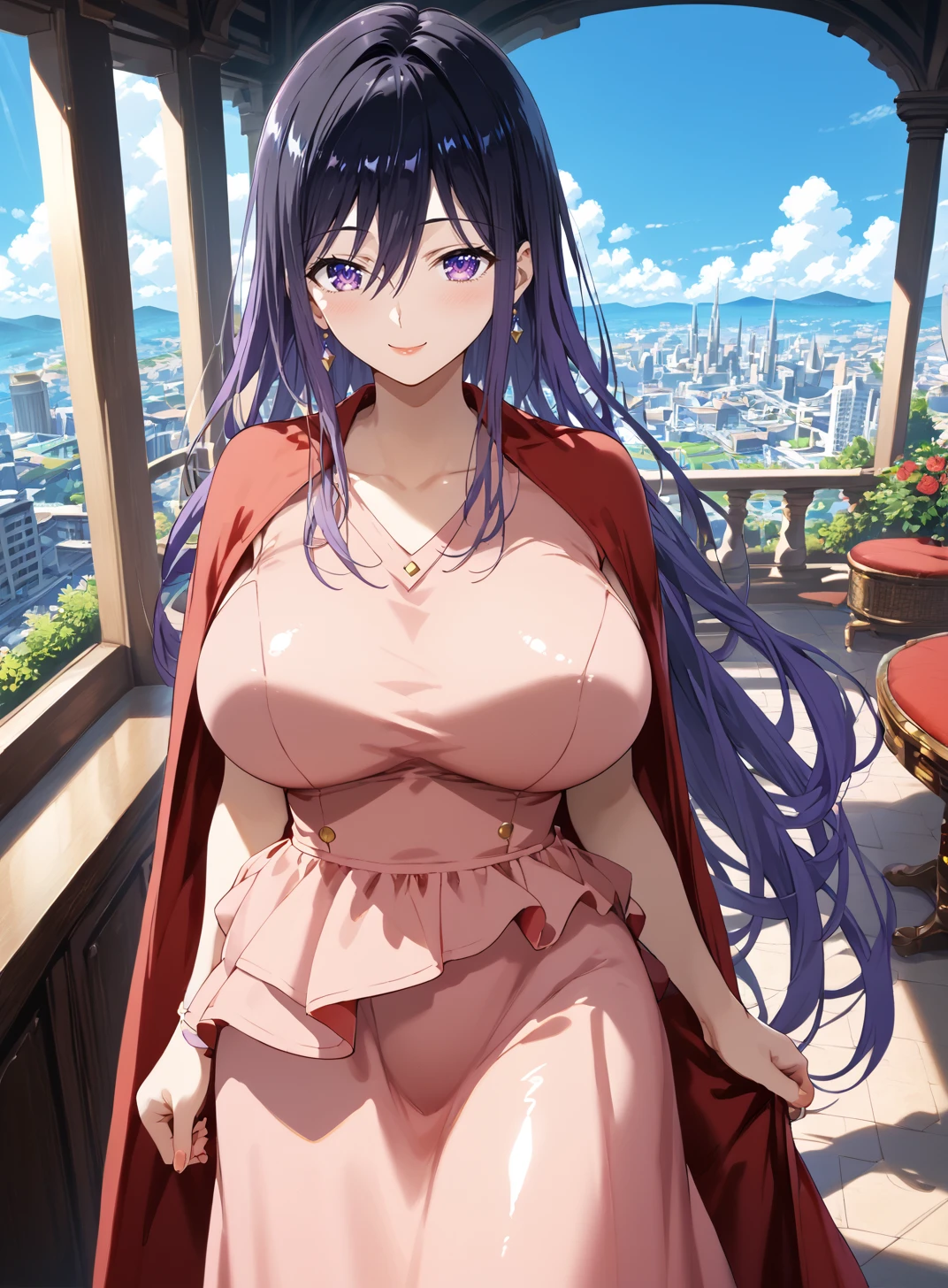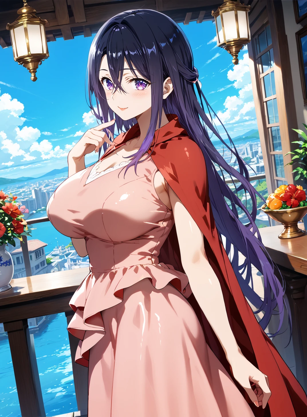 yukine araki, gradient hair, purple eyes, very long hair, hair between eyes, red cape, pink dress