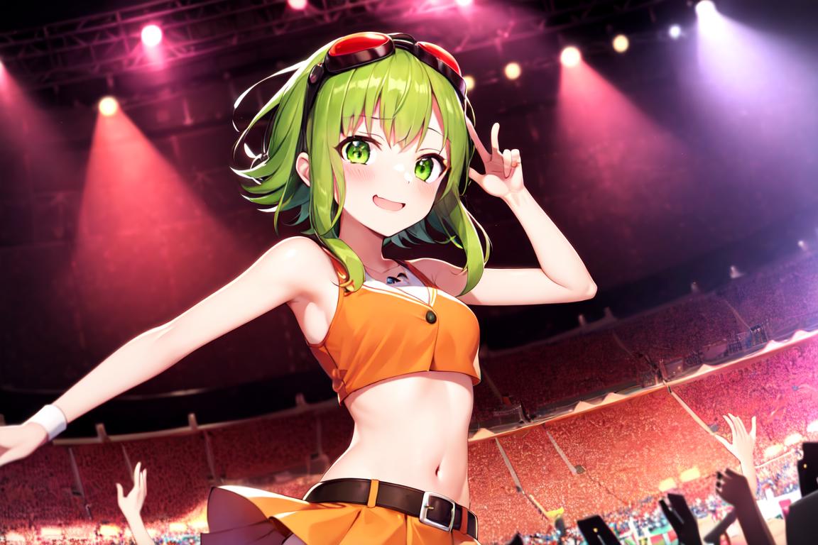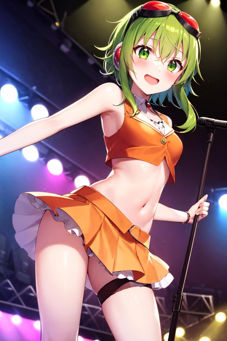 crop top, goggles on head, orange skirt, navel