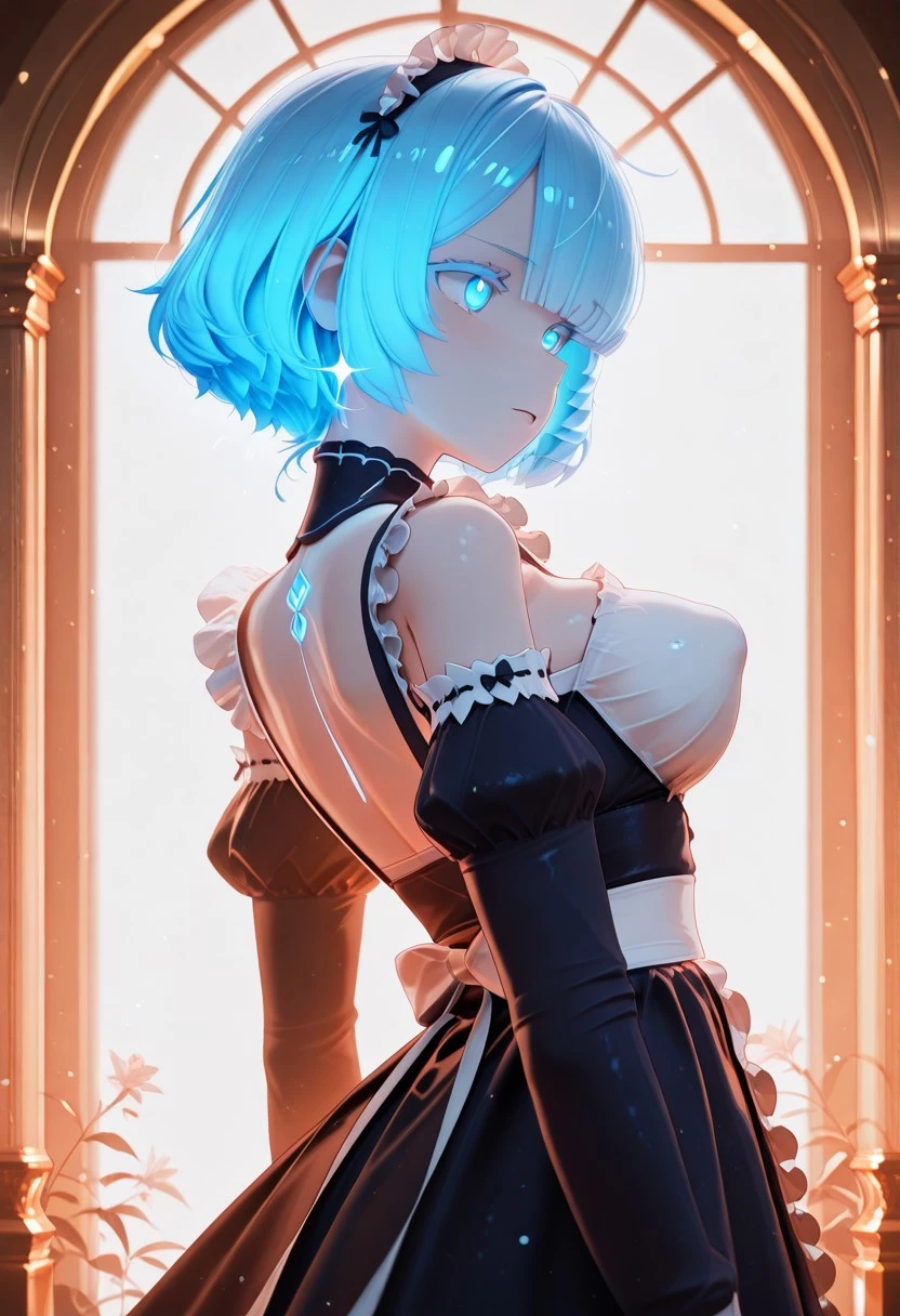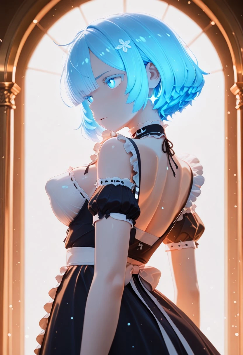 Trigger words: Rem, Re:Zero, maid dress, neon lighting, glossy 3D, cinematic bloom.