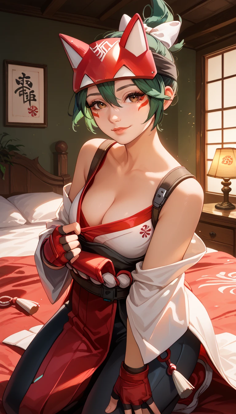 kiriko_ow, brown eyes, green hair, ponytail, hair between eyes, facial mark, facepaint, hair bow, white bow, fox mask, mask on head, white kimono, red hakama, black pants, multicolored pants, tassel, red gloves, fingerless gloves, red footwear,