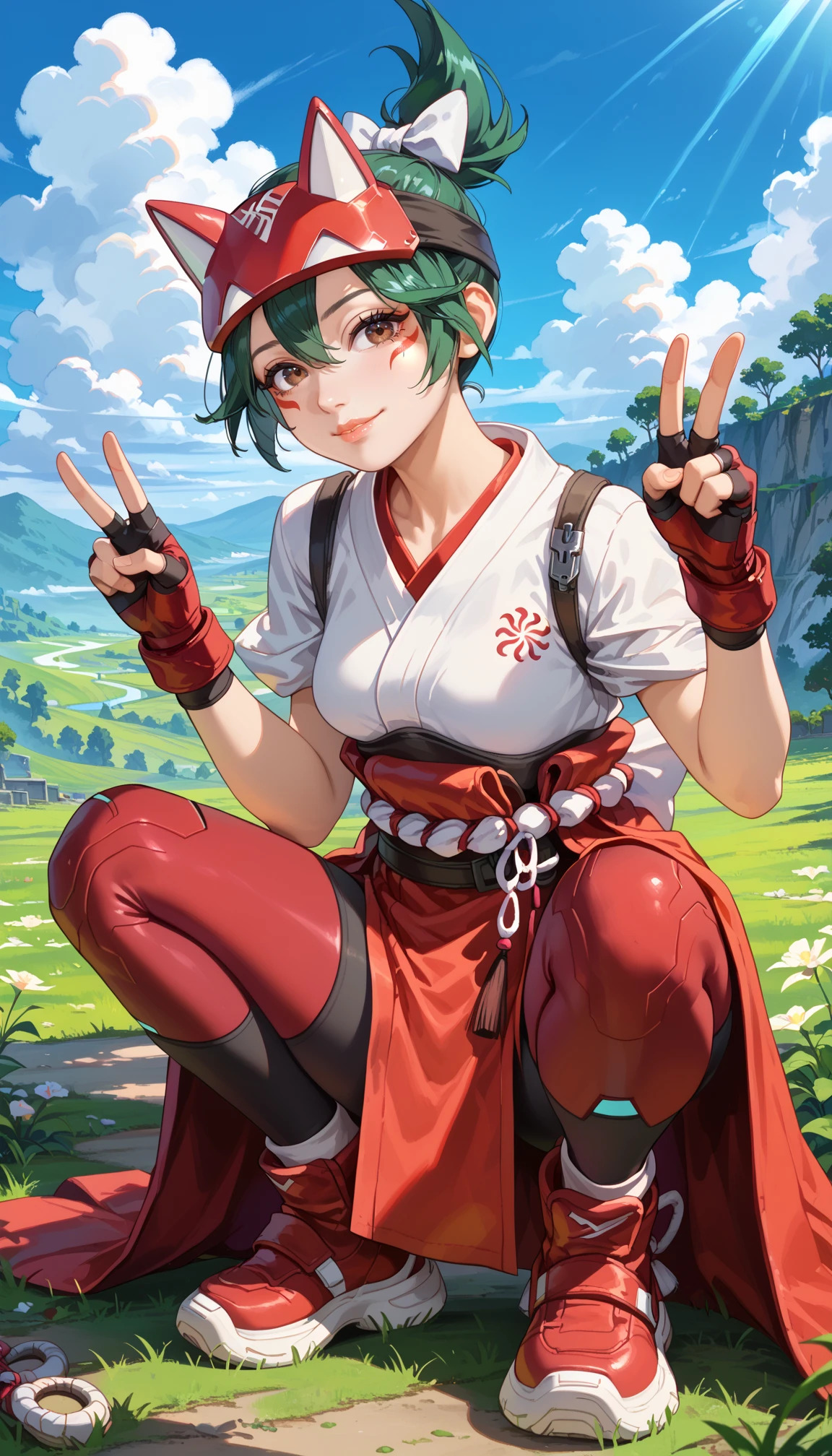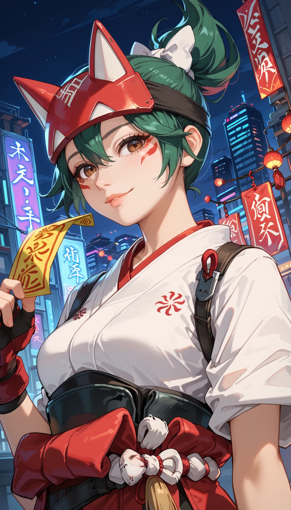 kiriko_ow, brown eyes, green hair, ponytail, hair between eyes, facial mark, facepaint, hair bow, white bow, fox mask, mask on head, white kimono, red hakama, black pants, multicolored pants, tassel, red gloves, fingerless gloves, red footwear, Description