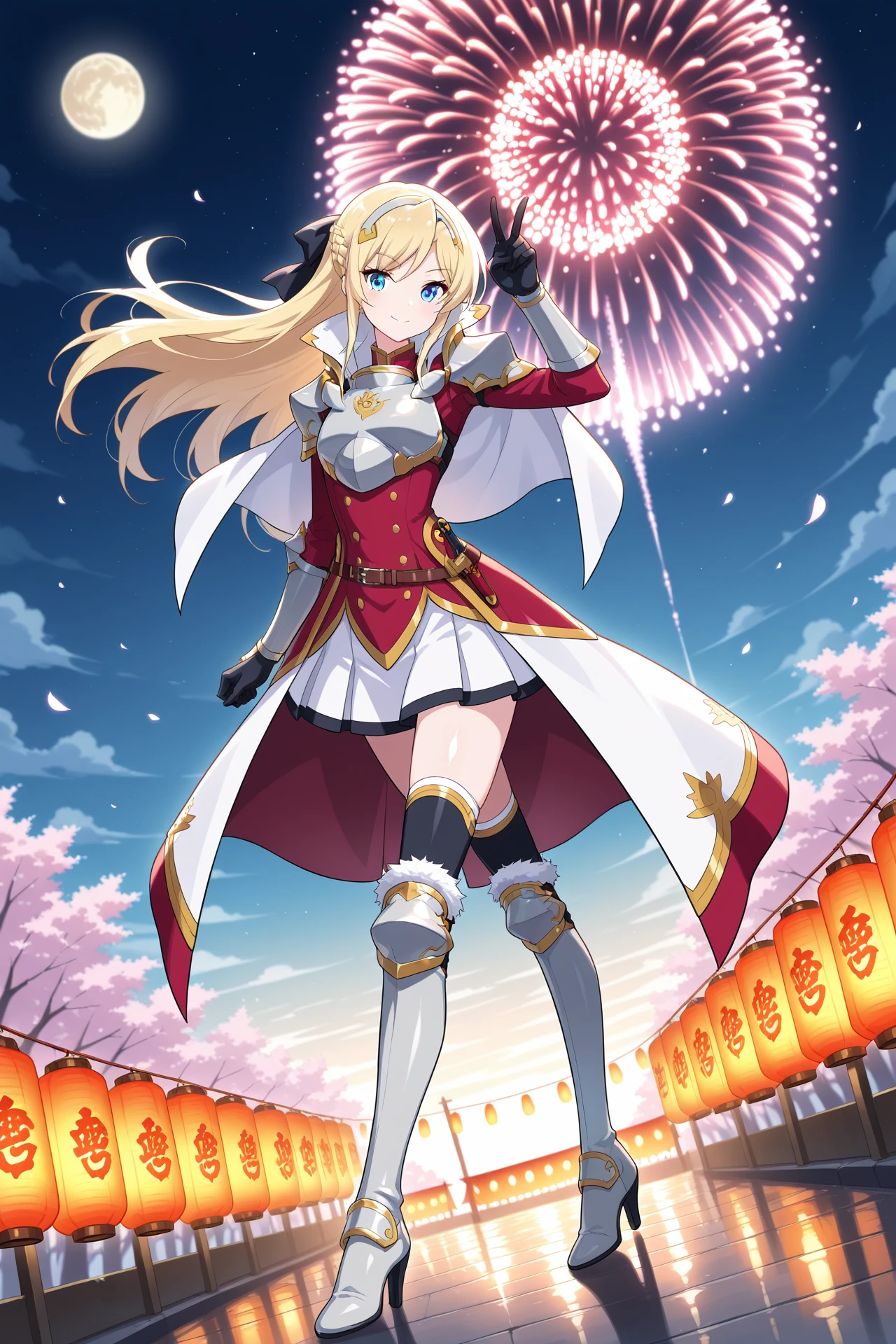 dress, armer, waist cape, white cape, white capelet, shoulder armer, breastplate, long sleeves, black gloves, brown belt, pauldrons, high collar, pleated skirt, miniskirt, white skirt, black thighhighs, high heel boots, thigh boots, armered boots, gray footwearDescription