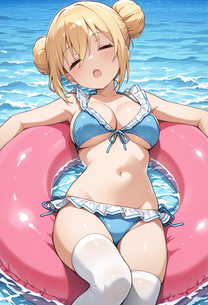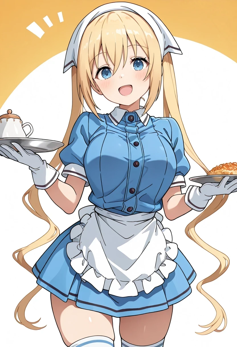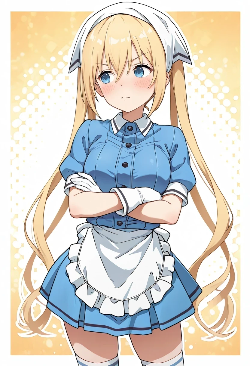 headscarf,white gloves,stile uniform,collared dress,blue shirt,blue skirt,Waist apron,white thighhighs,