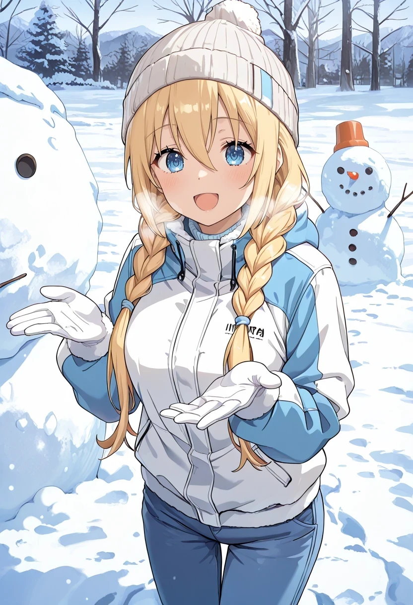 twin braids,hair over shoulder,beanie,two-tone jacket,blue jacket,white jacket,white gloves,blue pants,