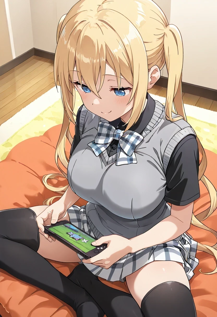 school uniform,grey sweater vest,short sleeves,plaid bowtie,black shirt,plaid skirt,pleated skirt,black thighhighs,