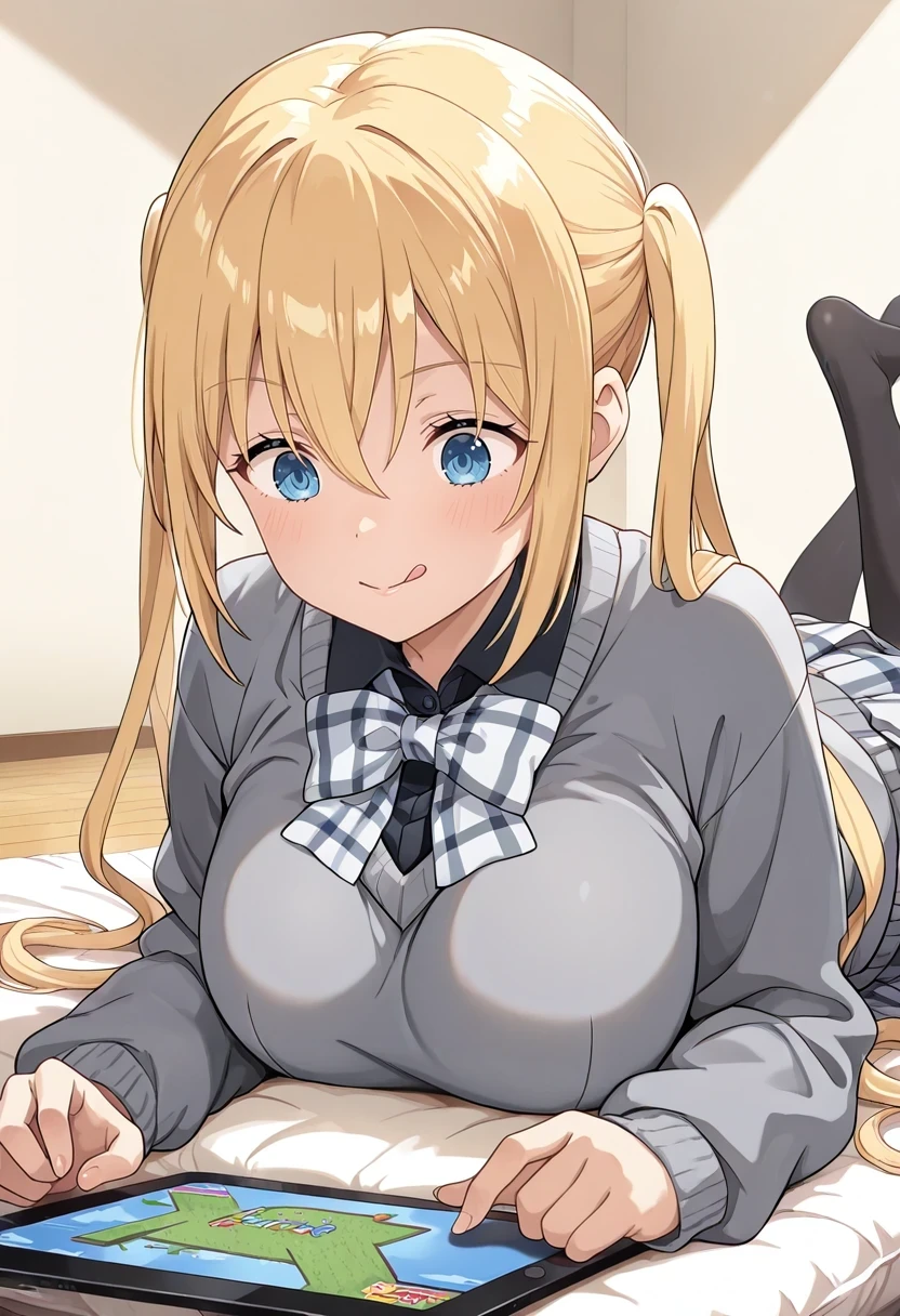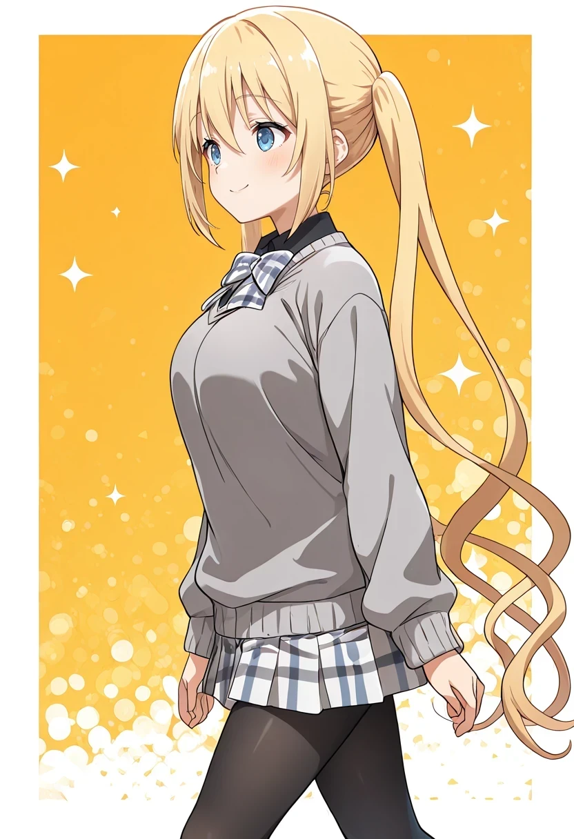 school uniform,grey sweater,plaid bowtie,black shirt,plaid skirt,pleated skirt,black pantyhose,