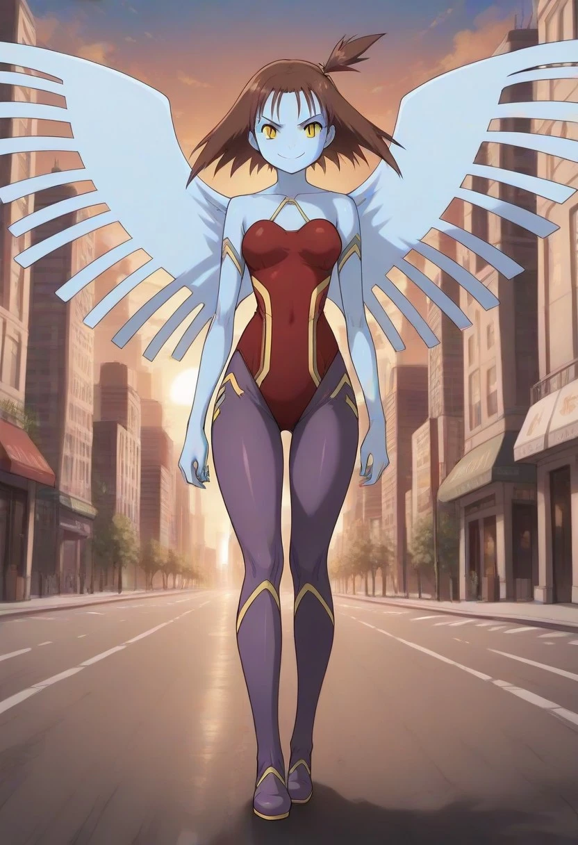 JTDgmTm, light-blue skin, spiky brown hair, side ponytail, yellow sclera, black slit pupils, red corset, purple legwear, square-ended wings