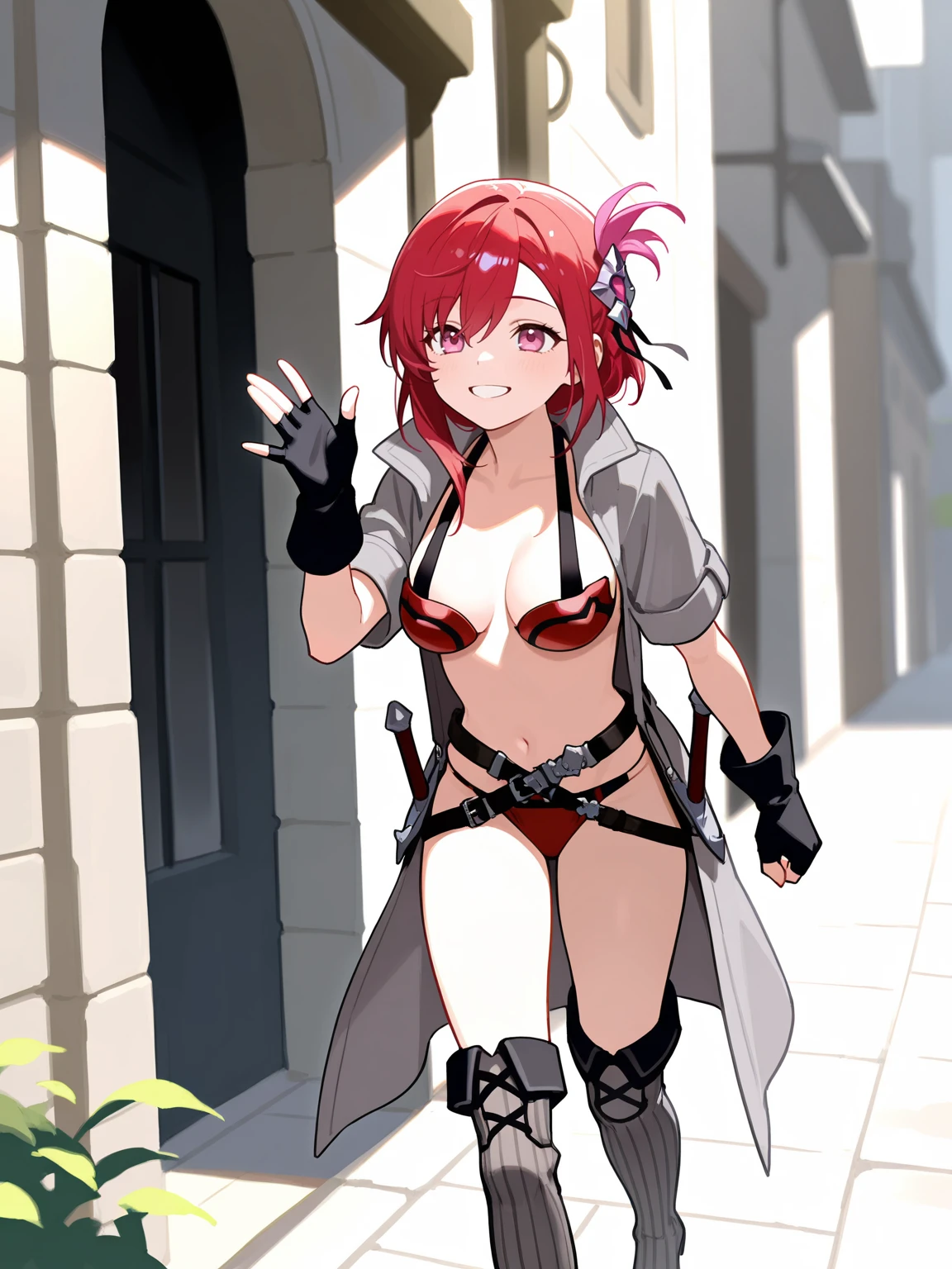 red bikini armor, (breast pads:1.2), string bikini bottom, grey coat, short sleeves, multiple belts, black belt, black gloves, fingerless gloves, thigh boots, grey boots, vertical-striped boots