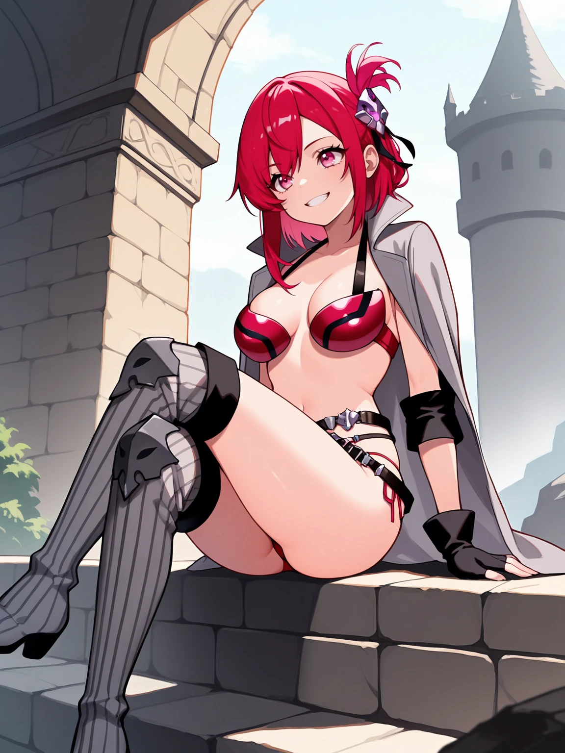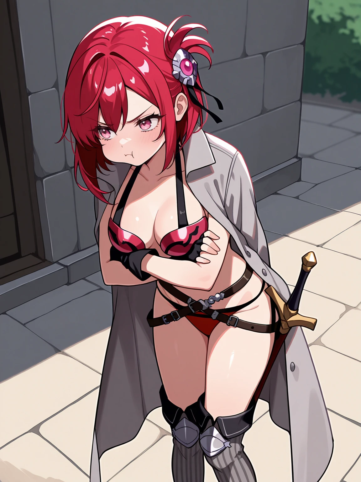 Outfit: red bikini armor, (breast pads:1.2), string bikini bottom, grey coat, short sleeves, multiple belts, black belt, black gloves, fingerless gloves, thigh boots, grey boots, vertical-striped boots