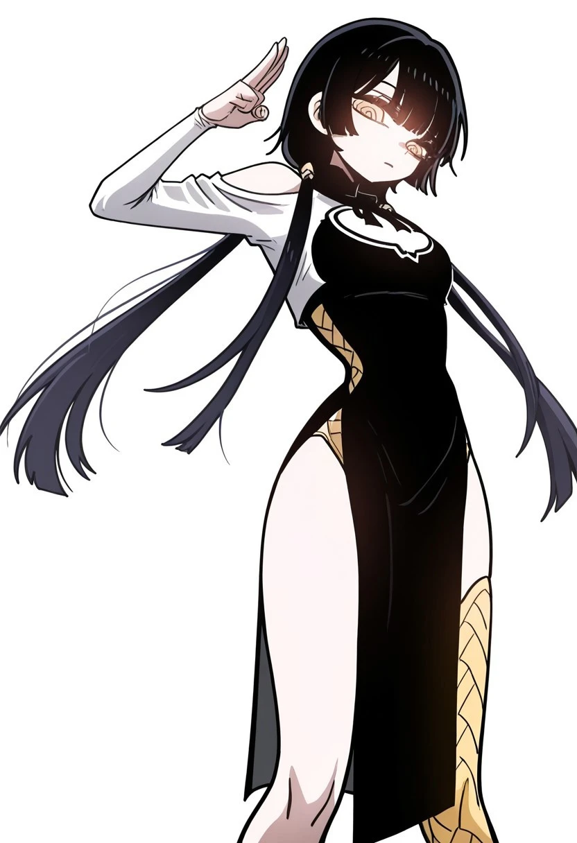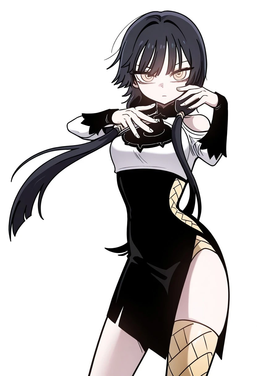 Moglay, long hair, black hair, bangs, twintails, golden eyes, black dress, white top, single leg thighhighs, yellow thighhighs