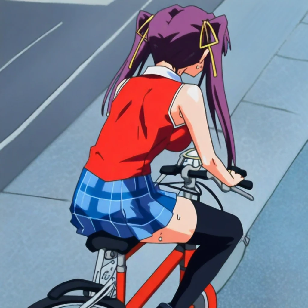 red shirt, sleeveless, blue plaid skirt, black thighhighs