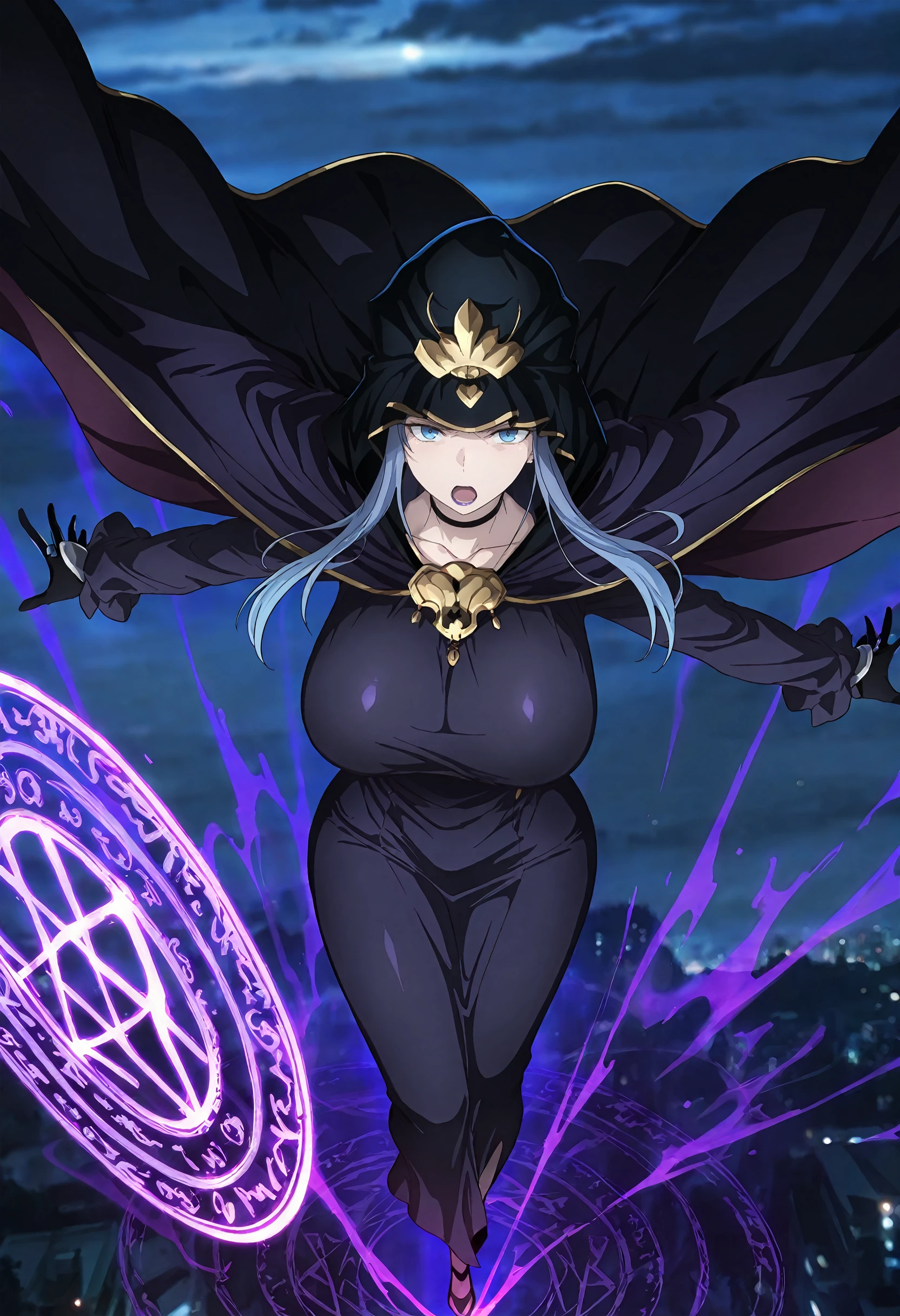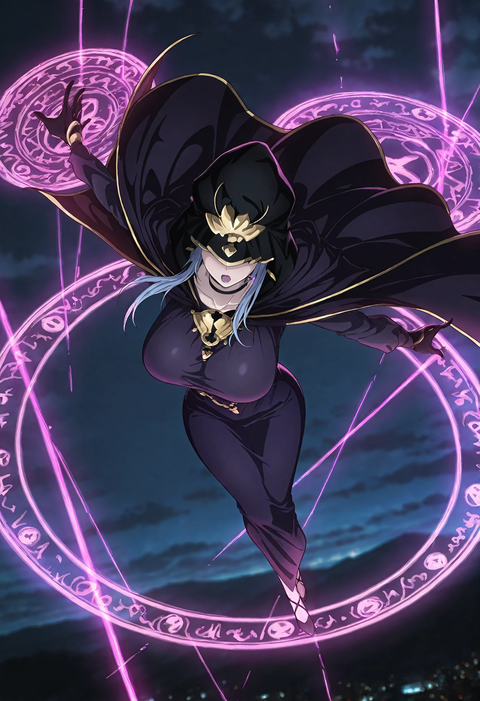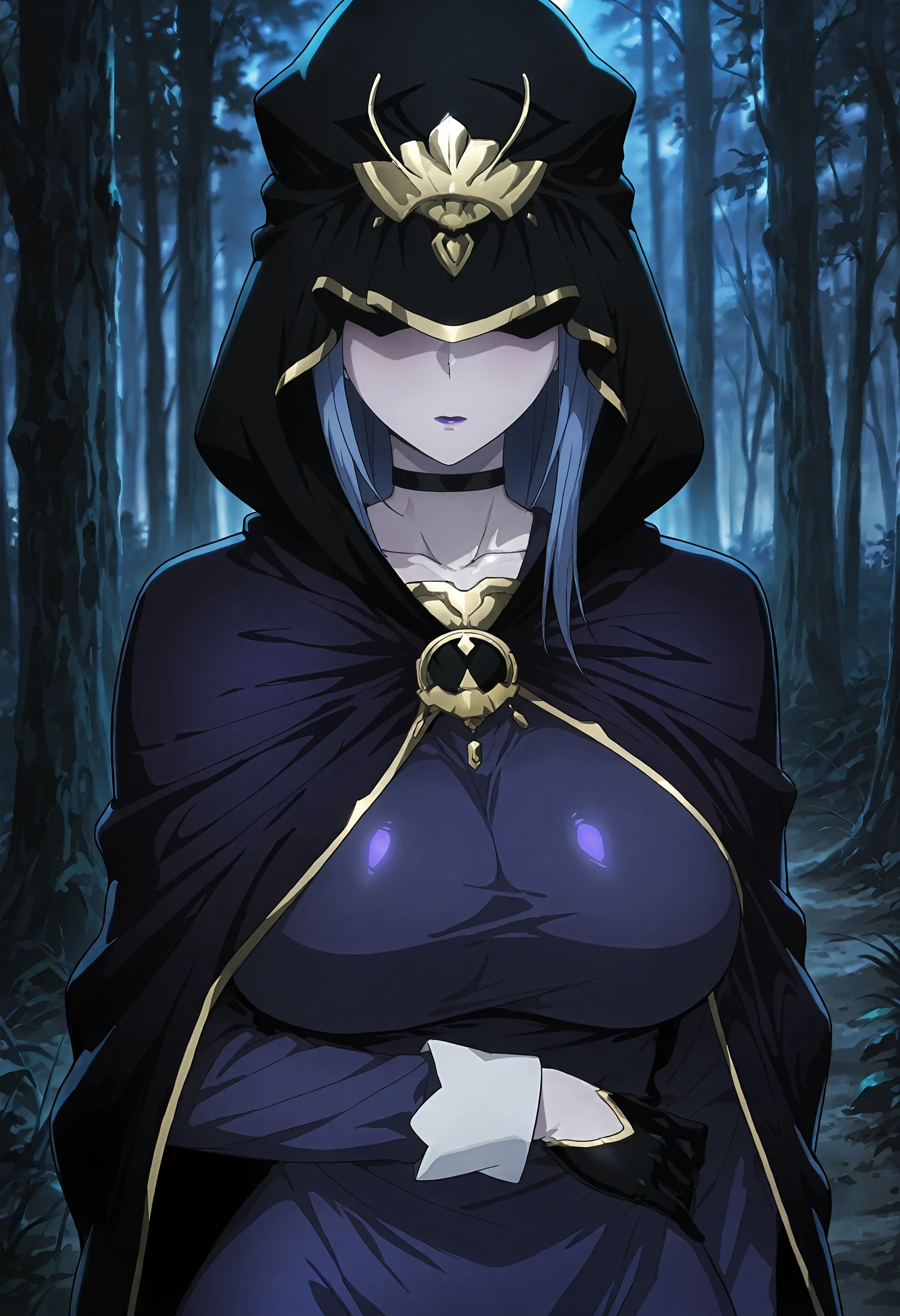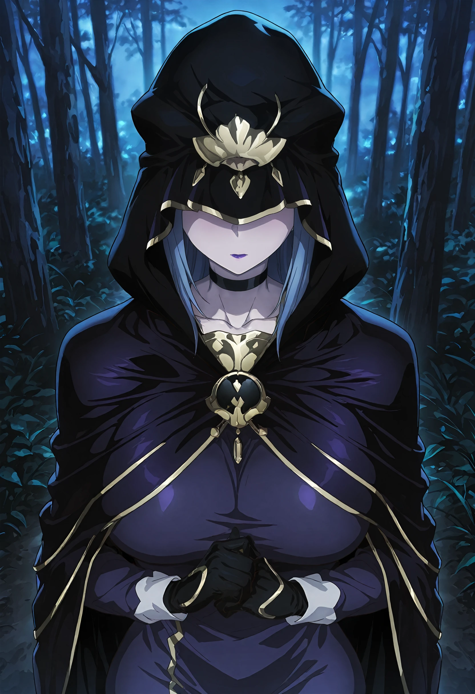 medea (fate), blue hair, purple lips, long hair, covered eyes, black choker, hooded cloak, hood up, purple cape, black cloak, collarbone, purple dress, pencil skirt, long sleeves, black gloves, long dress