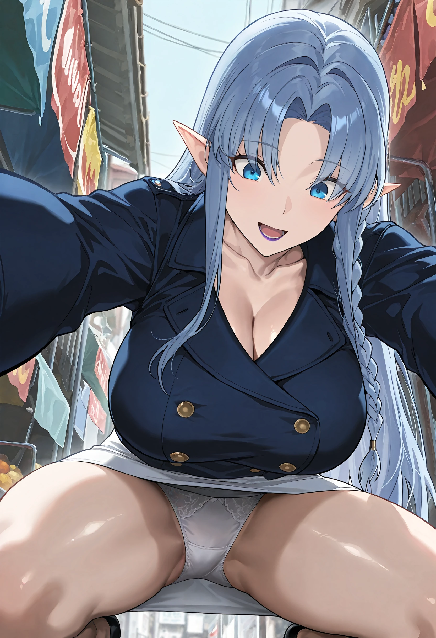 medea (fate), blue hair, purple lips, long hair, blue eyes, parted bangs, single braid, pointy ears, collarbone, blue coat, double-breasted, long sleeves, white skirt, pencil skirt, miniskirt