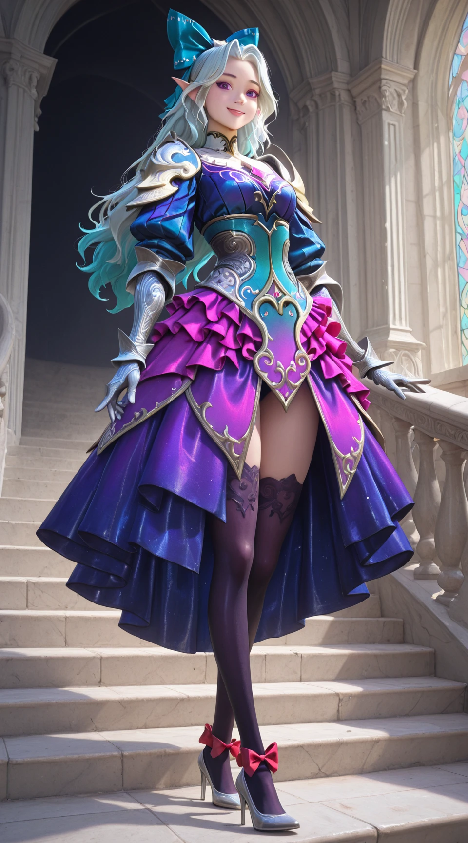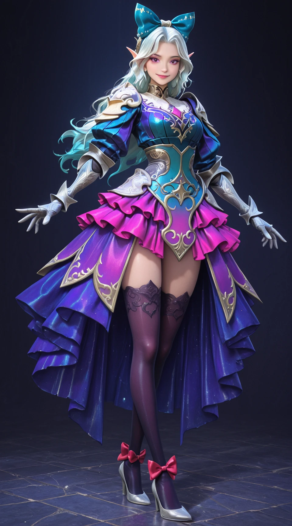 Example Prompt: mlbb_selena_coc, blue_hair_bow, gauntlets, curse_dress, thighhighs, red bow_high_heels, looking_at_viewer, smile
