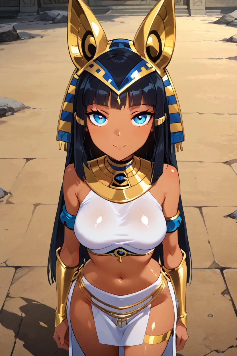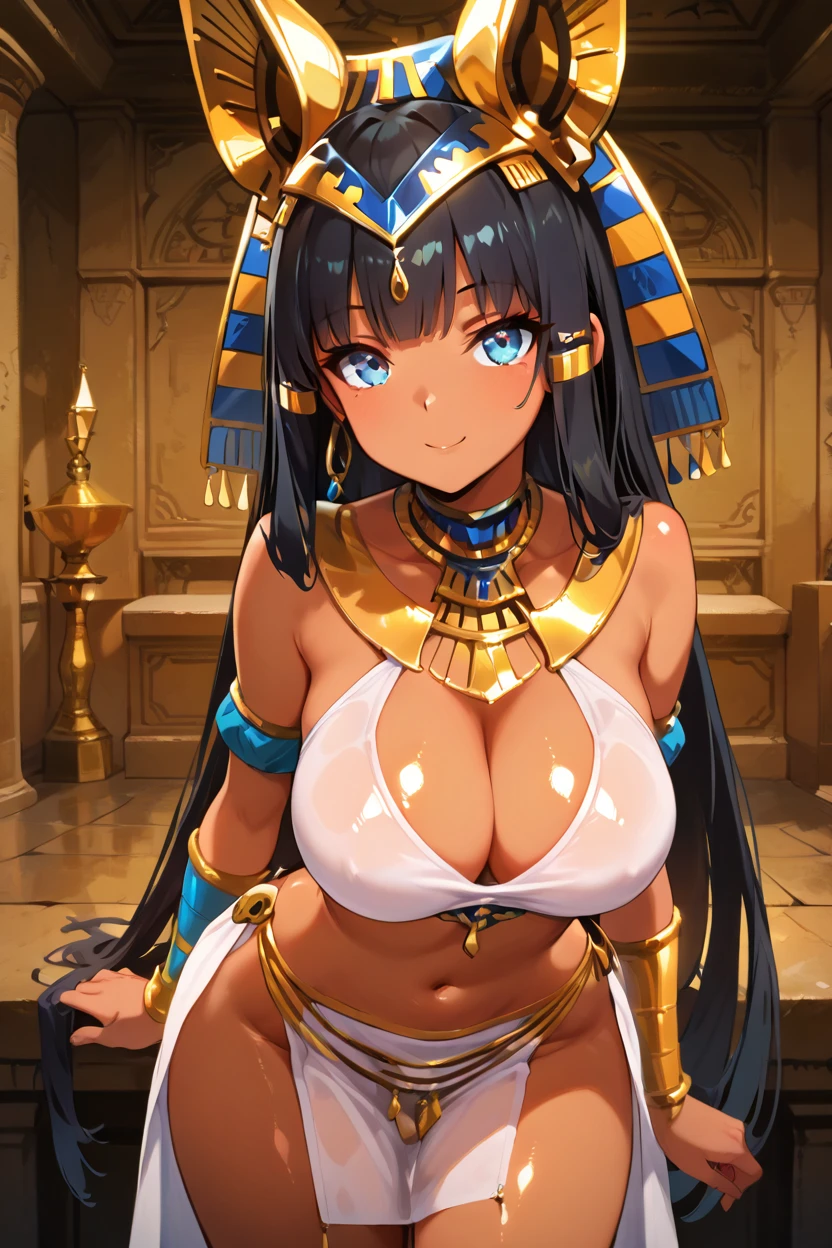 zzRamesses, blue eyes, black hair, dark skin, pharaoh's headdress, jewelry, gold, white crop top, white pelvic curtain,