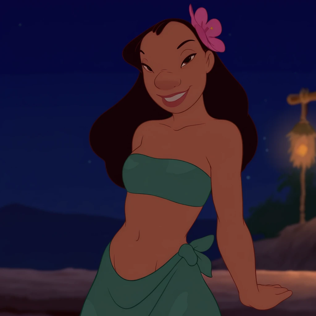 Hawaiian outfit: Nani Pelekai, 1girl, long hair, breasts, skirt, black hair, hair ornament, navel, bare shoulders, collarbone, flower, small breasts, midriff, hair flower, dark skin, dark-skinned female, lips, strapless, lipstick, green skirt, bandeau, tube top