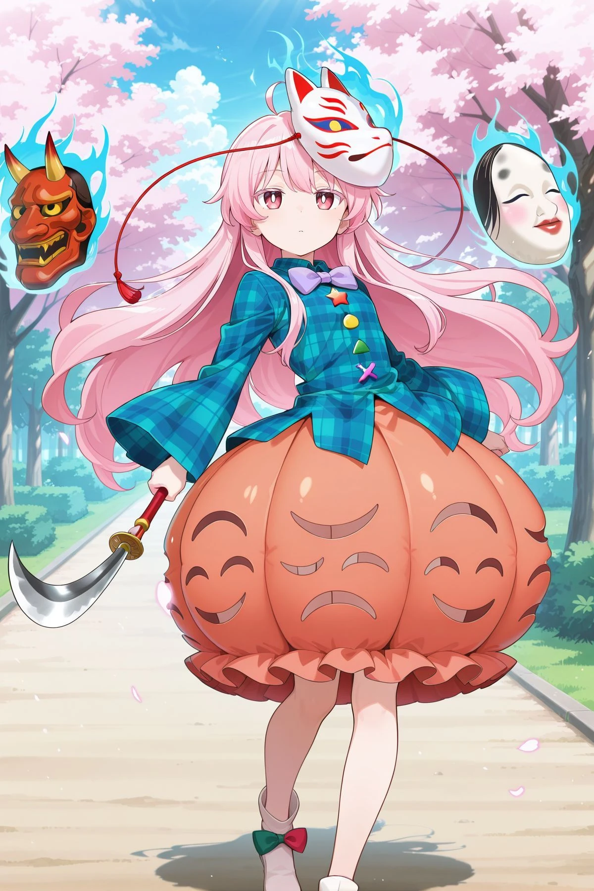 hata no kokoro, 1girl, solo, pink hair, pink eyes, long hair, very long hair, expressionless,plaid, bow, bowtie, bubble skirt, plaid shirt, fox mask,Alternative :