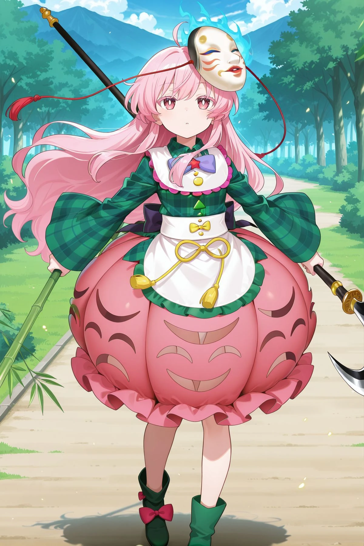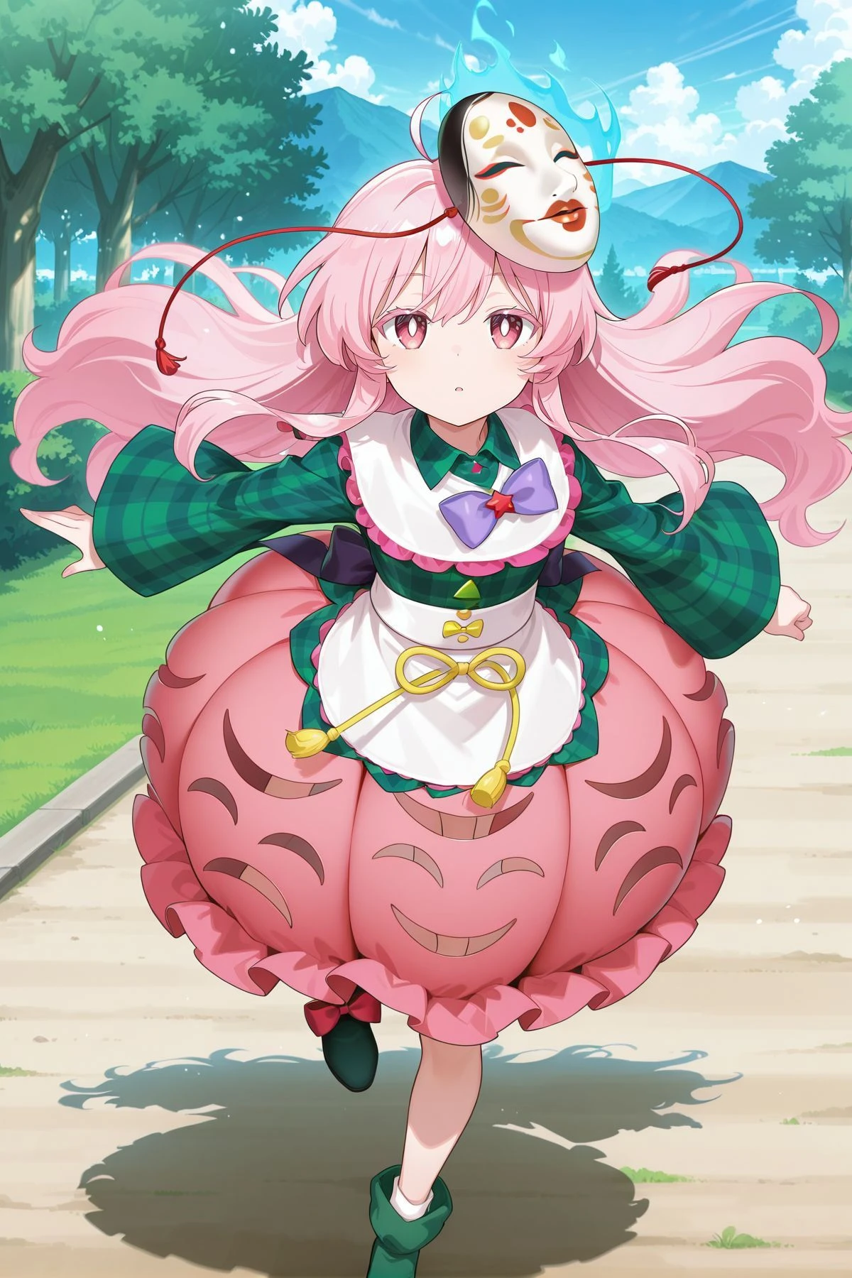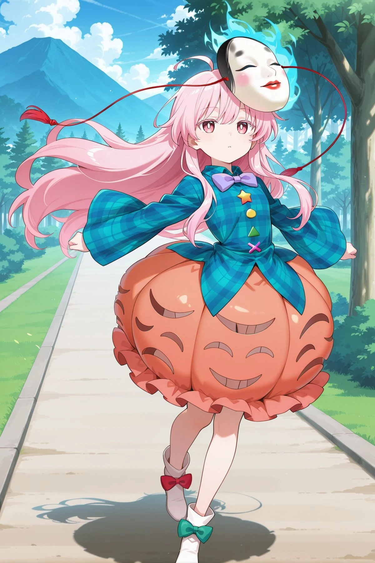hata no kokoro, 1girl, solo, pink eyes, white pupils, bright pupils, pink hair, long hair, ahoge,mask on head, purple bowtie, aqua shirt, plaid shirt, long sleeves, wide sleeves, buttons, bubble skirt, orange skirt, white shoes, footwear bow, green bow, red bow,Optional :
