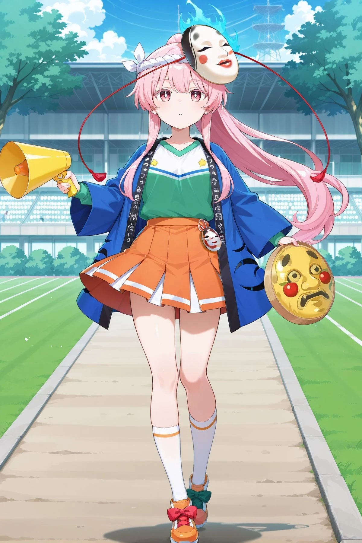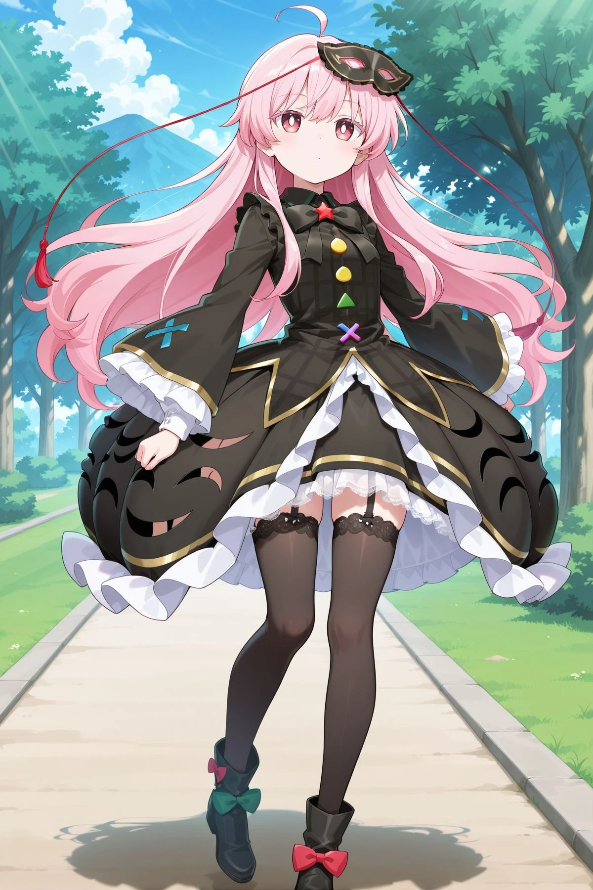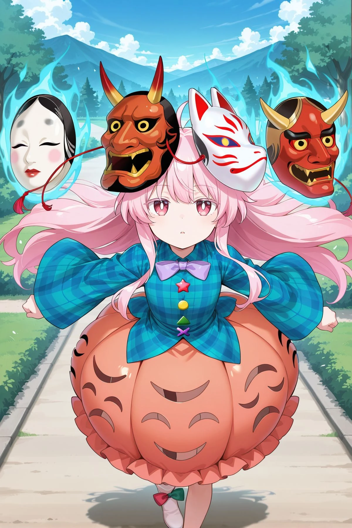 hata no kokoro, 1girl, solo, pink eyes, white pupils, bright pupils, pink hair, long hair, ahoge,mask on head, purple bowtie, aqua shirt, plaid shirt, long sleeves, wide sleeves, buttons, bubble skirt, orange skirt, white shoes, footwear bow, green bow, red bow,Optional :