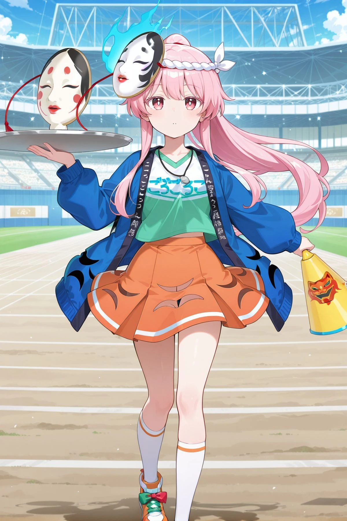 hata no kokoro, 1girl, solo, pink eyes, white pupils, bright pupils, pink hair, long hair, ahoge, hata no kokoro \(pseudo-servant teireita\), alternate costume, mask on head, purple bowtie, green shirt, plaid shirt, long sleeves, wide sleeves, bubble skirt, pink skirt, green shoes, footwear bow, red bow, teireida mai (cosplay), holding polearm, holding bamboo,hata no kokoro, 1girl, solo, pink eyes, white pupils, bright pupils, pink hair, long hair, ahoge, hata no kokoro, 1girl, solo, pink eyes, white pupils, bright pupils, pink hair, low-tied long hair, sidelocks,, hata no kokoro \(sixty-six expressive white masks\), alternate costume, mask on head, noh mask, hair flower, white flower, white kimono, print kimono, floral print, white skirt, frilled skirt, long sleeves, wide sleeves, holding fan,hata no kokoro, 1girl, solo, pink eyes, white pupils, bright pupils, pink hair, long hair, ahoge, hata no kokoro \(noh artist of song and dance\), alternate costume, mask on head, eye mask, black bow, black bowtie, black dress, lace-trimmed dress, frilled dress, buttons, long sleeves, layered sleeves, wide sleeves, white sleeves, black thighhighs, black boots, footwear bow, green bow, red bow, microphone stand,hata no kokoro, 1girl, solo, pink eyes, pink hair, long hair, high ponytail,, hata no kokoro \(not so cheerful-looking cheerleader\), alternate costume, headband, nejiri hachimaki, mask on head, noh mask, megaphone necklace, blue jacket, open jacket, long sleeves, two-tone shirt, green shirt, white shirt, orange skirt, kneehighs, white socks, two-tone shoes, white shoes, orange shoes, footwear bow, green bow, red bow, holding tray,Hata no Kokoro (Multi-Display3r) :