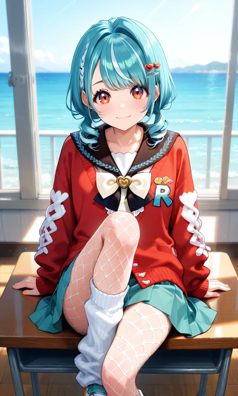 shiranami ramune, ramune sailor, short hair, low twintails, drill hair, hairclip, serafuku, bowtie, yellow bow, white shirt, short sleeves, aqua skirt, pleated skirt, fishnet pantyhose, leg warmersYou can change her hairstyle using