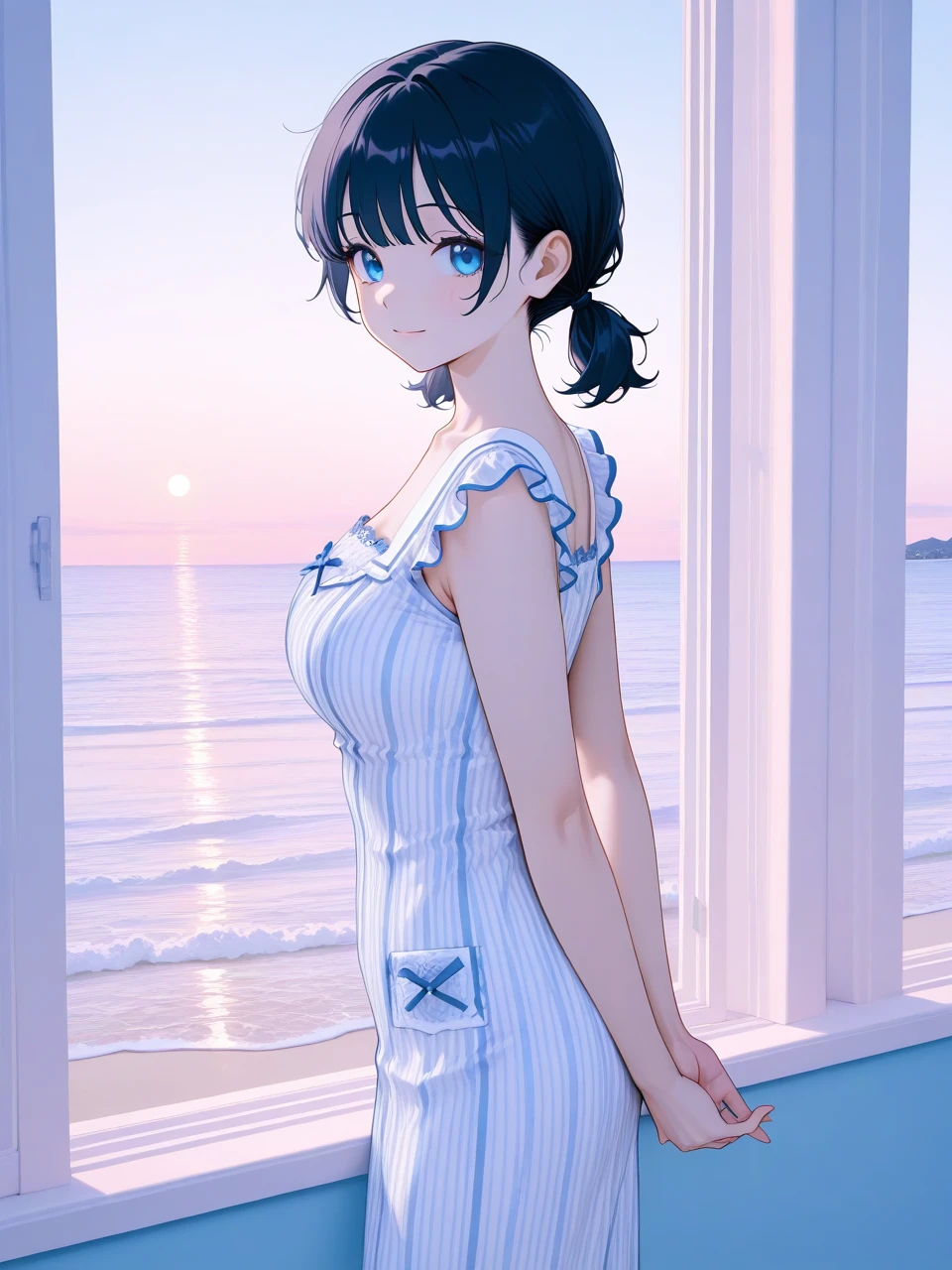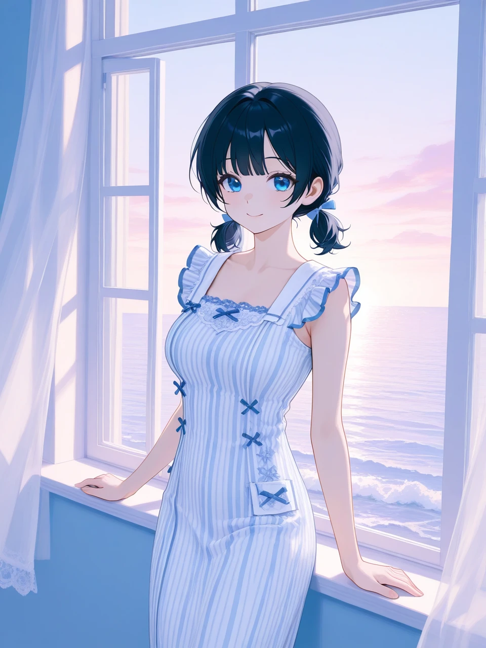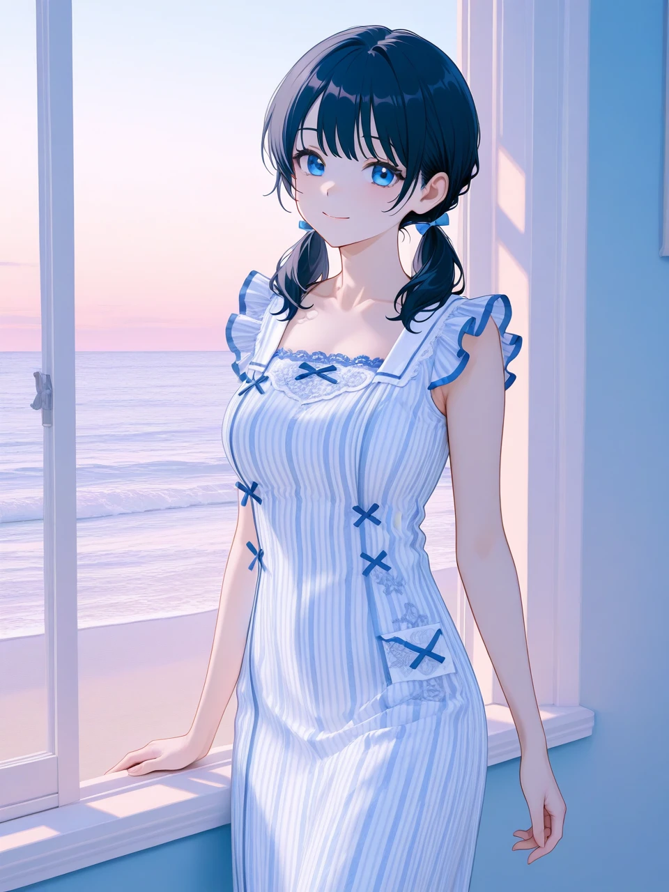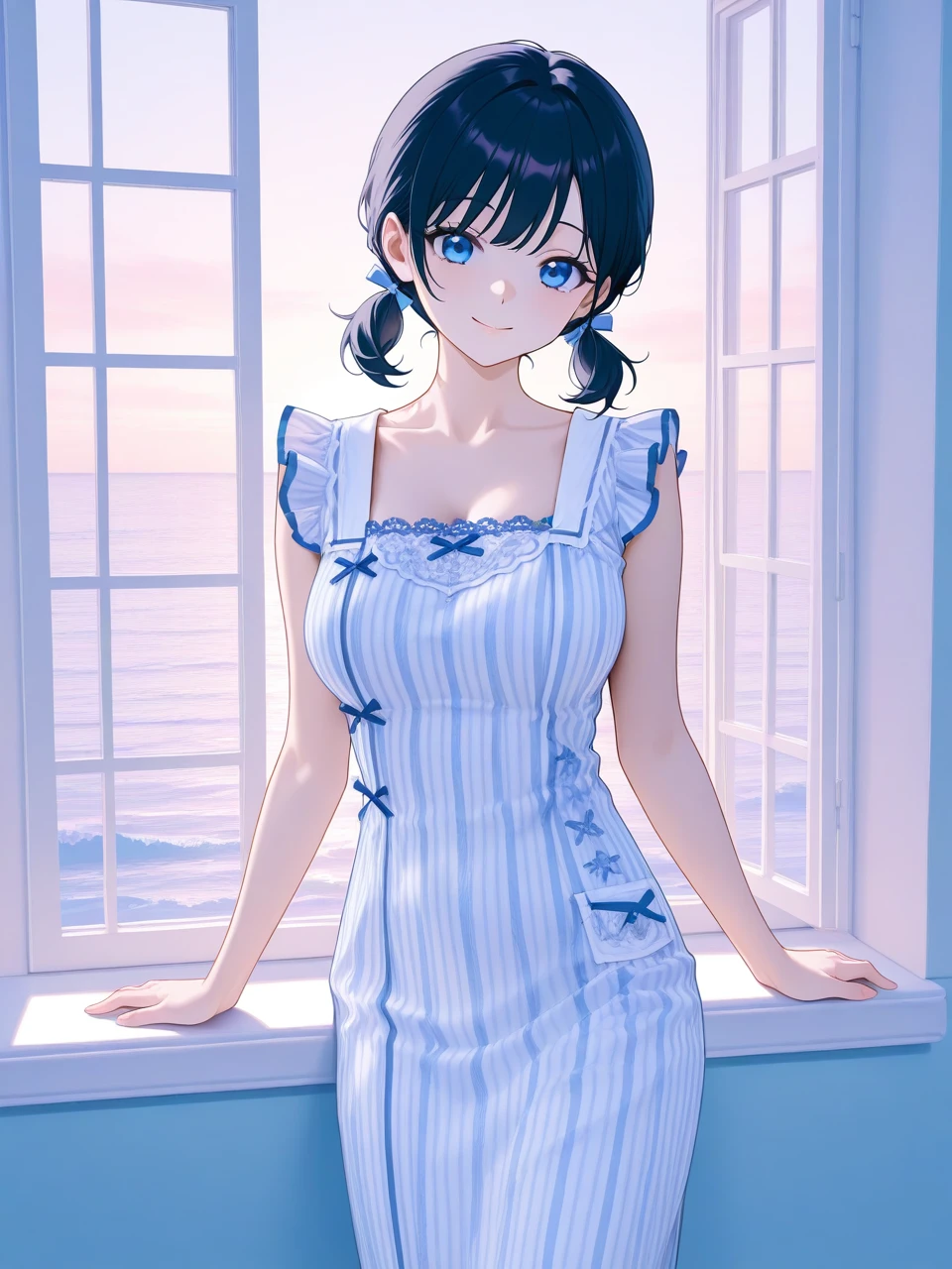 vertical-striped sleeveless pencil dress,white long dress,blue vertical strip,lace trim,blue bow,frills,neckless,