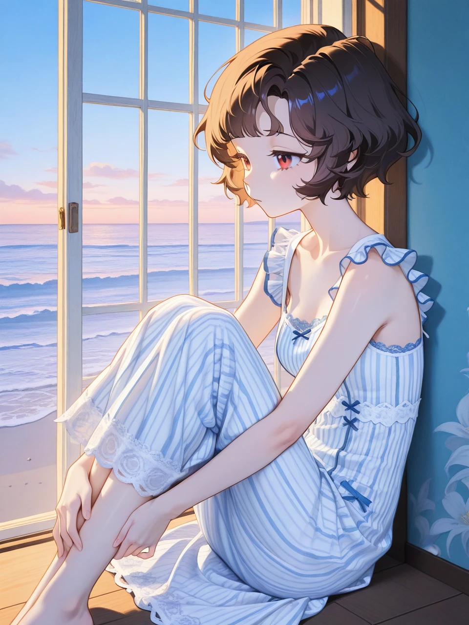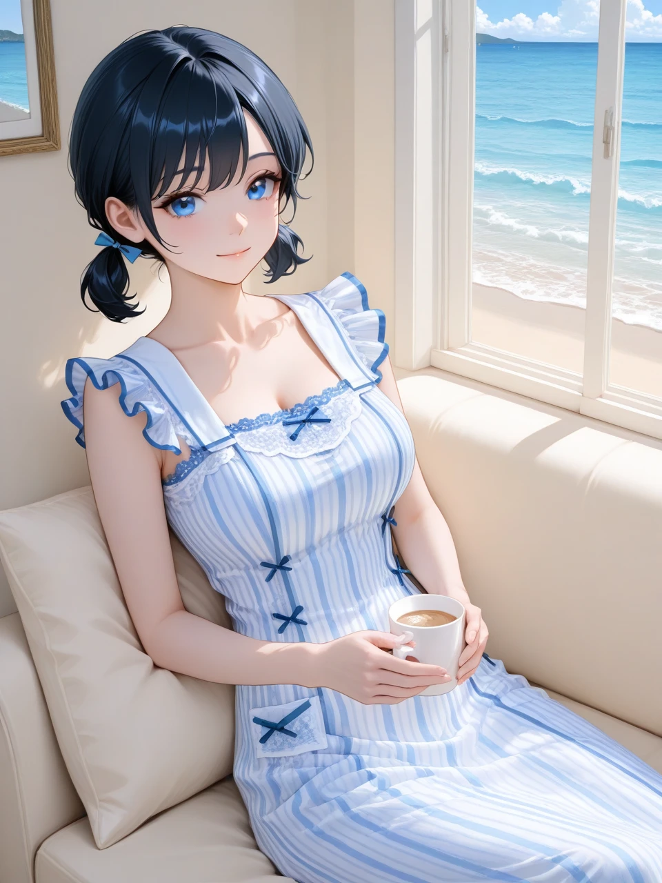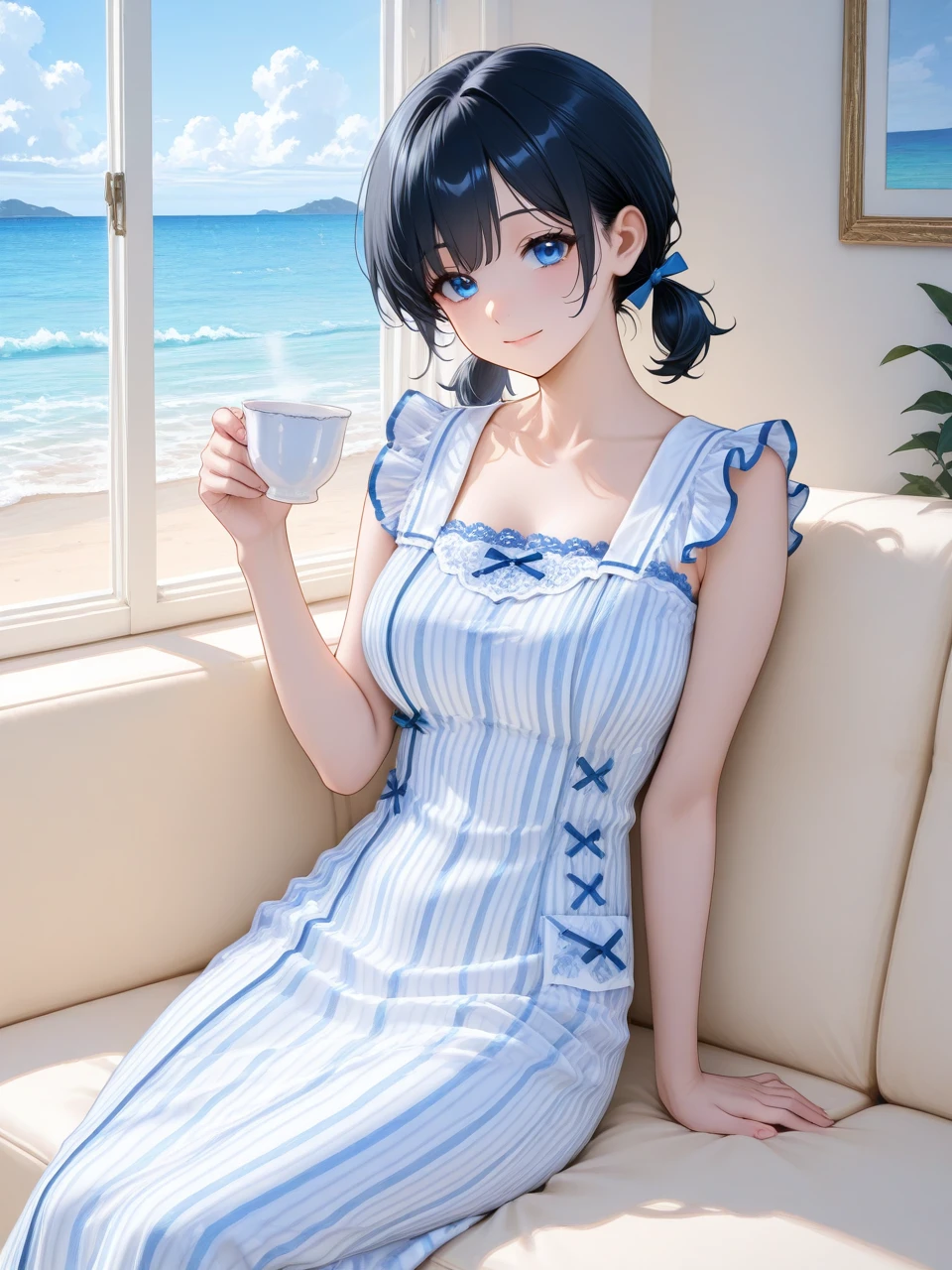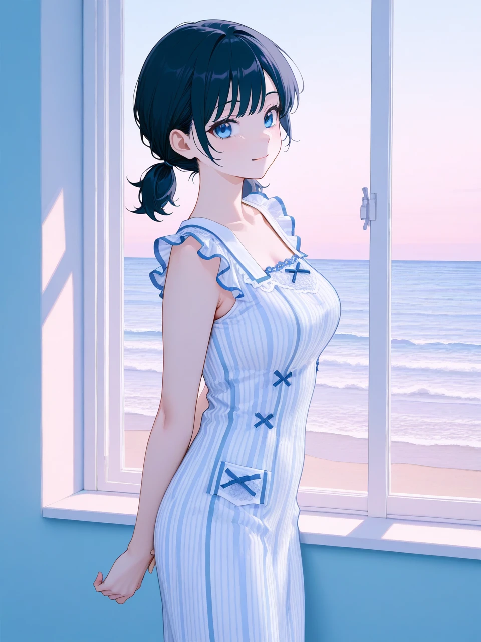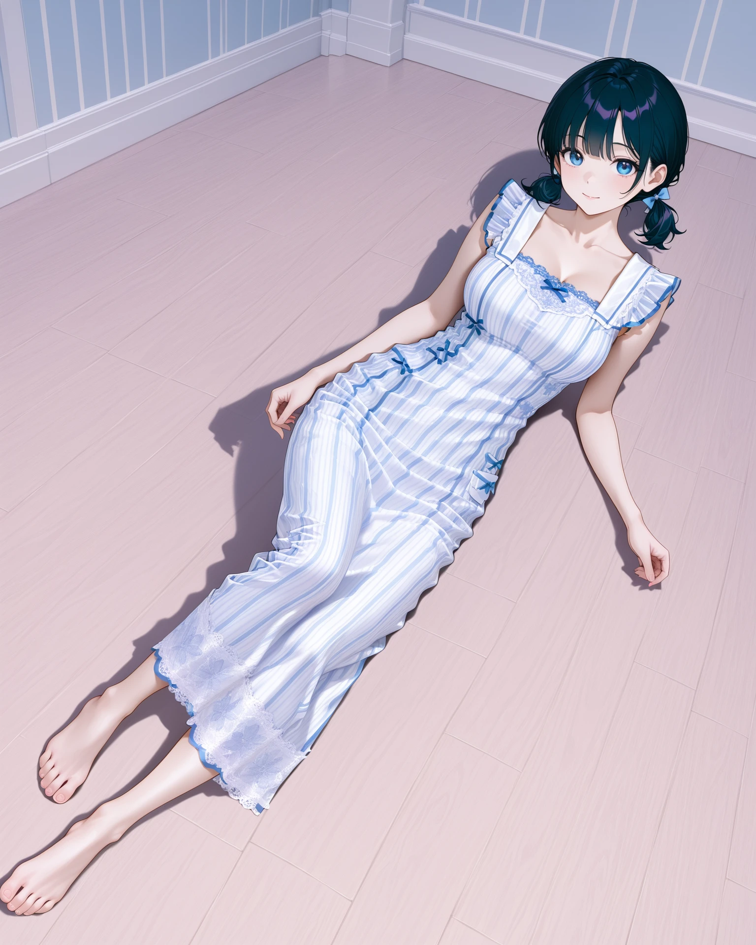 vertical-striped sleeveless pencil dress,white long dress,blue vertical strip,lace trim,blue bow,frills,neckless,