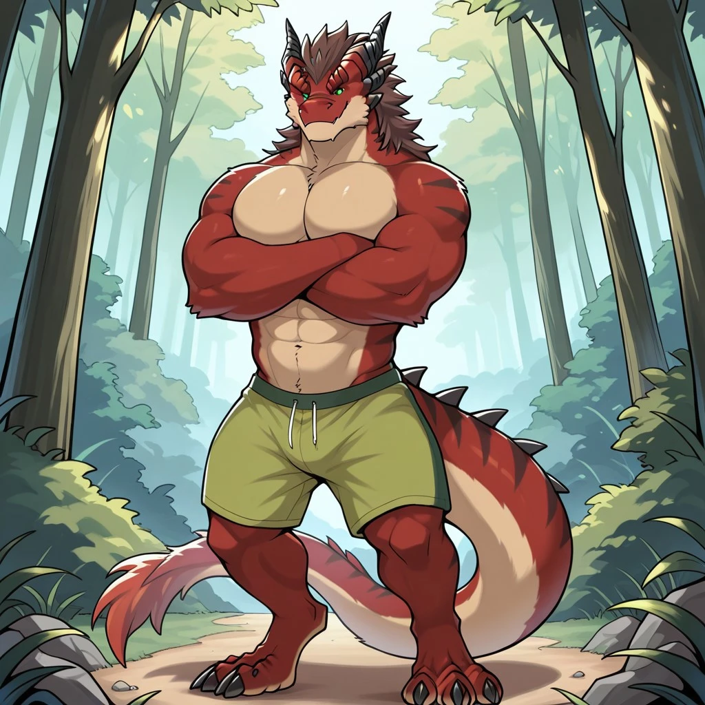 muscular figure, bara, dragon, furred dragon, red and tan fur, black stripes, green eyes, brown hair, long hair, dragon horns, dragon tail, tail spikes, claws, pectorals, abs,