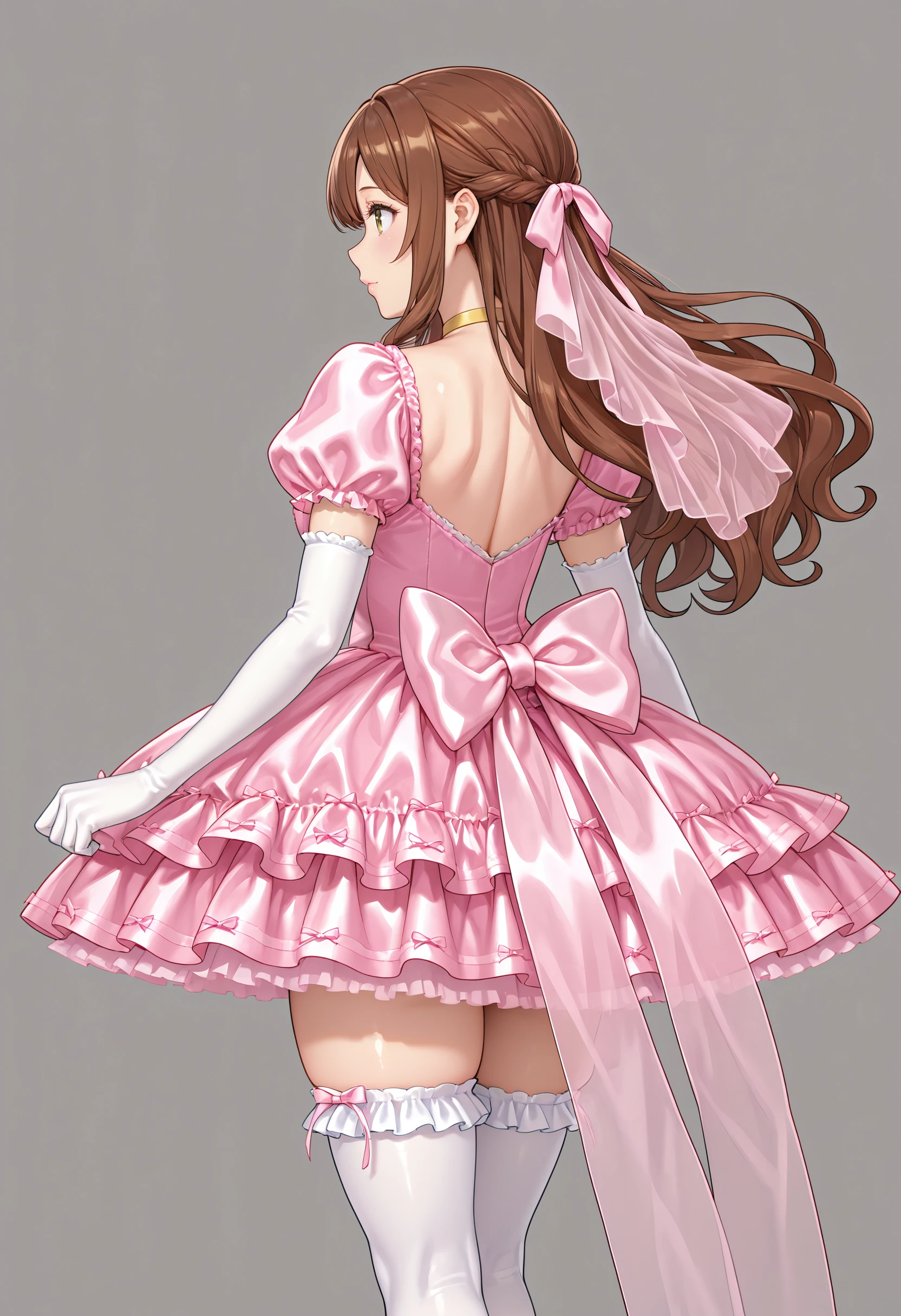 short pink dress,silk satin dress,heartbrooch,pink bow,miniskirt,petticoat,frilled thighhighs,zettai ryouiki