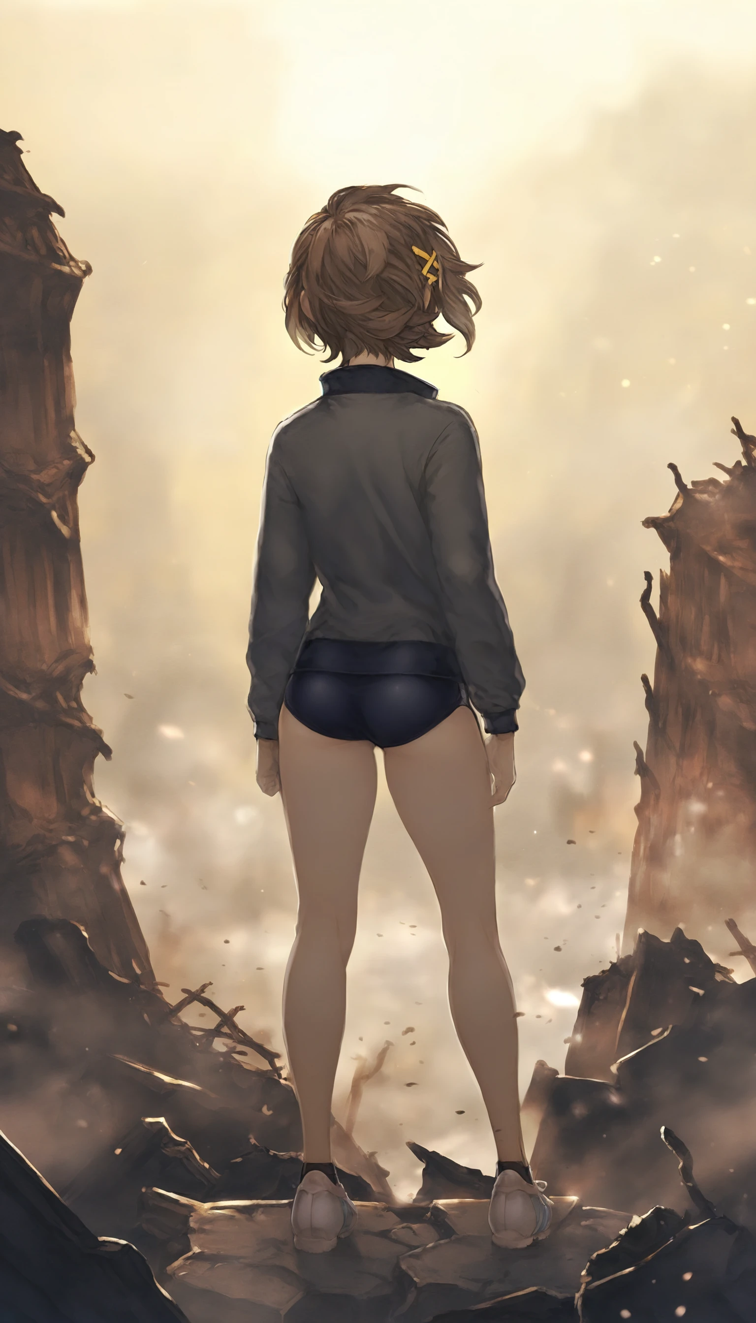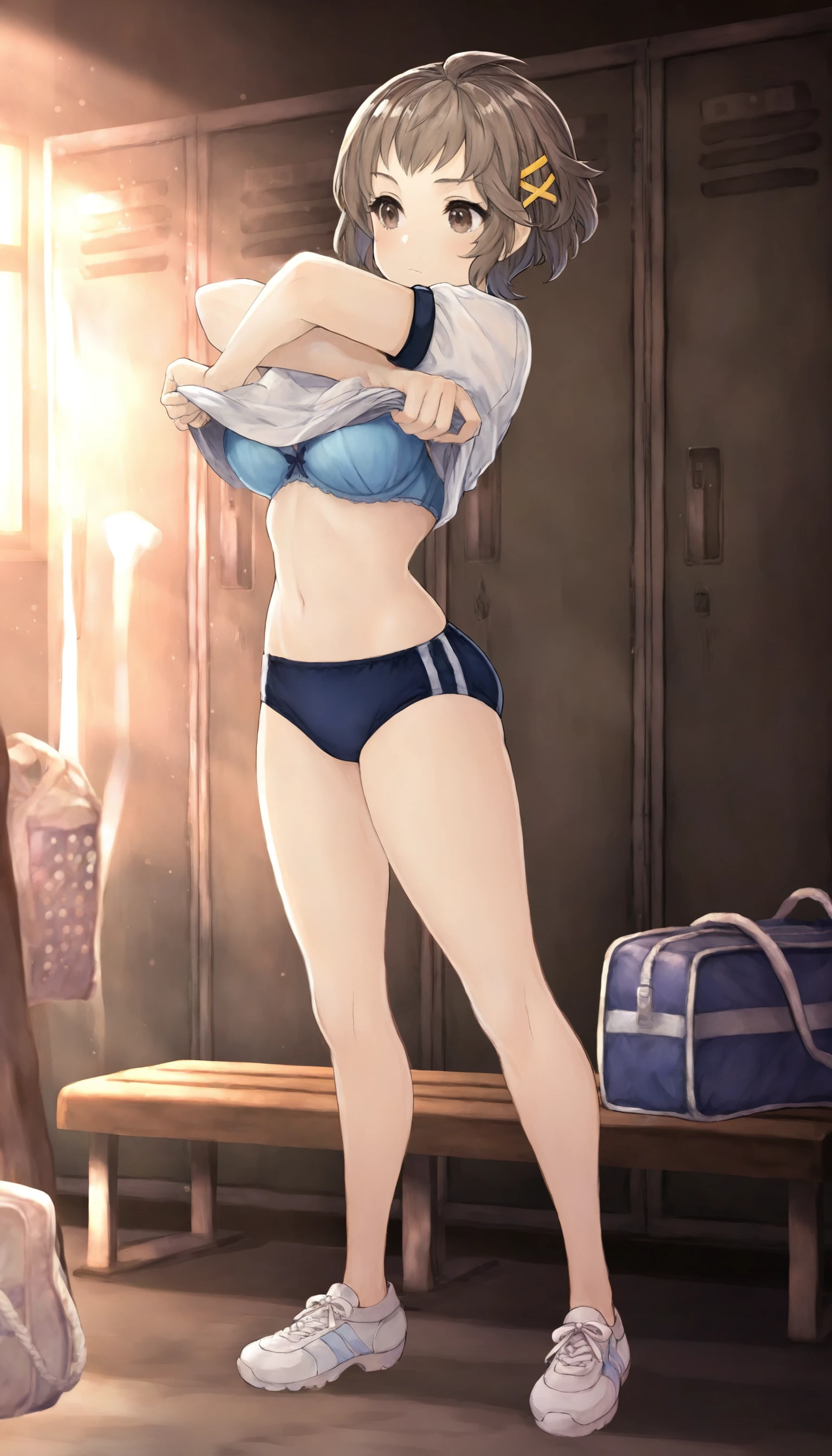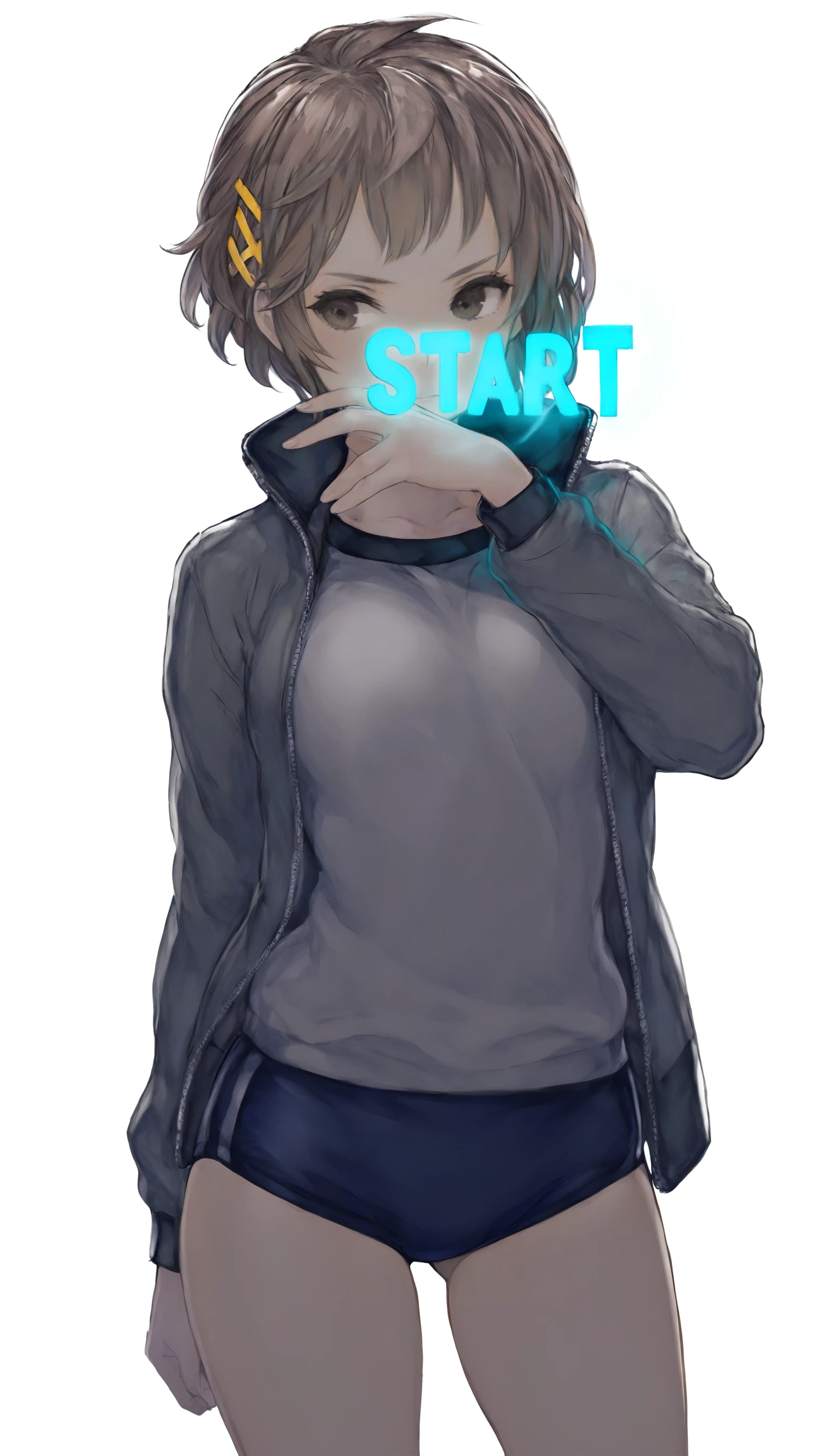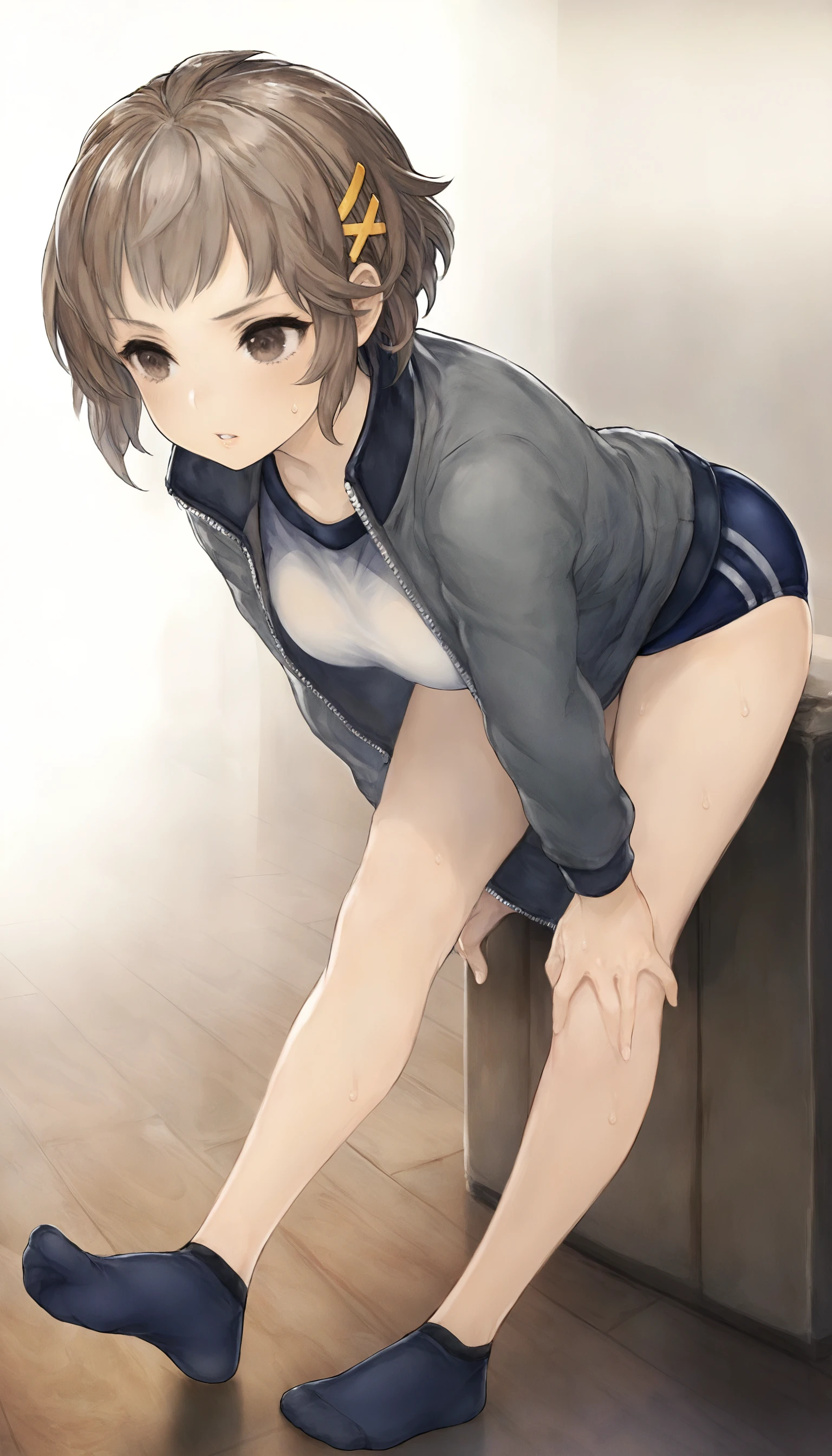 natsunominami, 1girl, solo, brown hair, short hair, bangs, brown eyes, yellow hairpin, grey jacket, gym uniform, blue gym shorts, black ankle socks, white sports shoes,Grey Shirt & Black Pleated Skirt