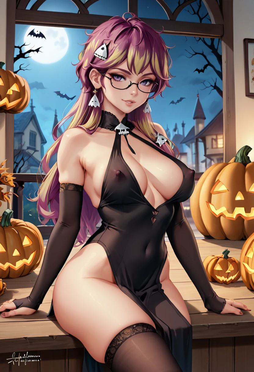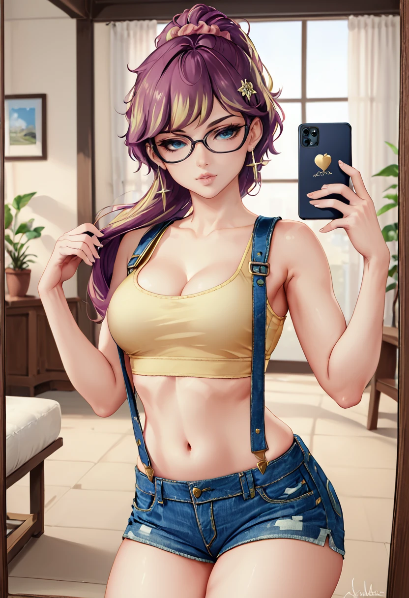 solo, 1girl, seraphina, looking at viewer, blue jacket, shirt, neck ribbon, skirt, black skirt, thighhighs, cross earrings, blue_eyes, jewelry, multicolored hair, denim shorts, navel, breasts, sports bra, medium breasts, leotardDescription