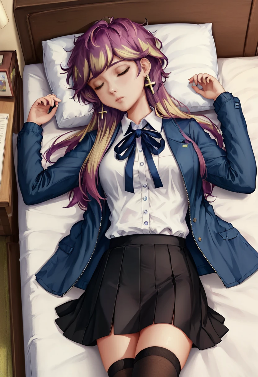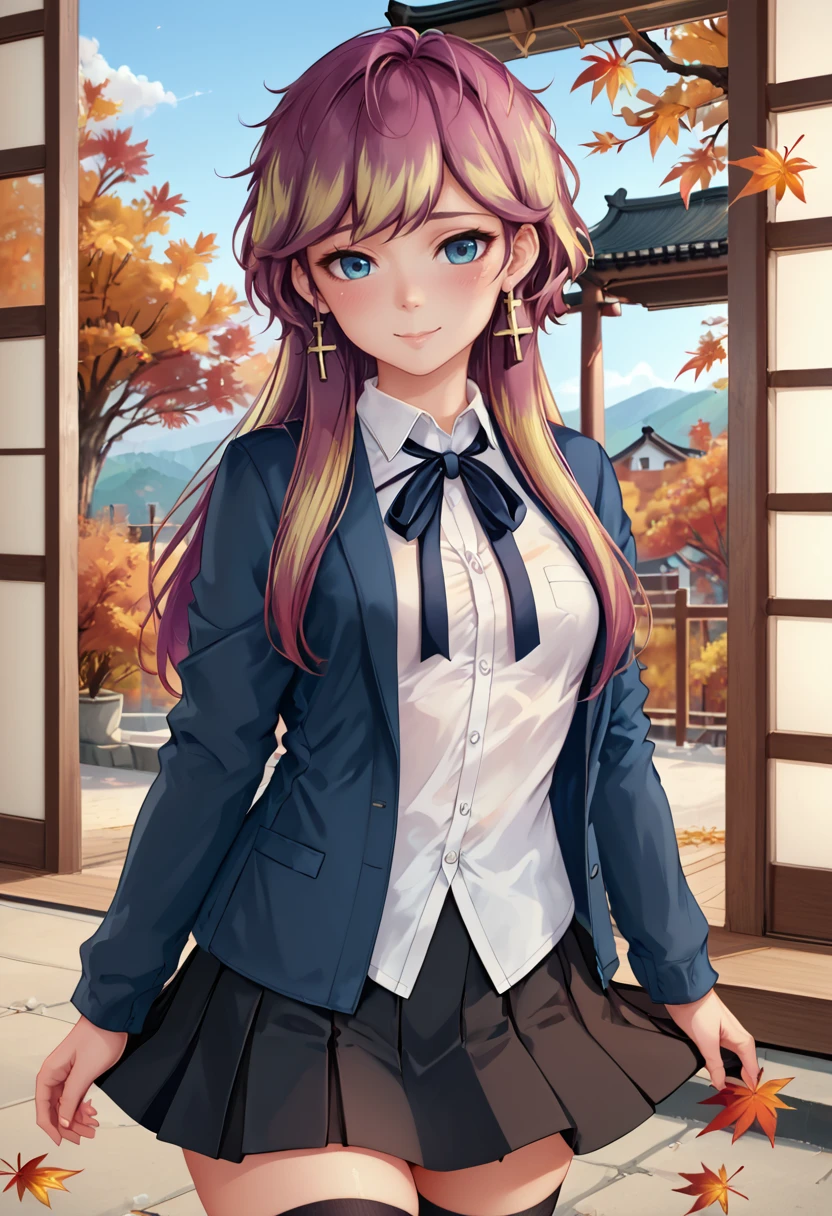 blue jacket, shirt, neck ribbon, skirt, black skirt, thighhighs, cross earringsTags that frequently appear in training material: