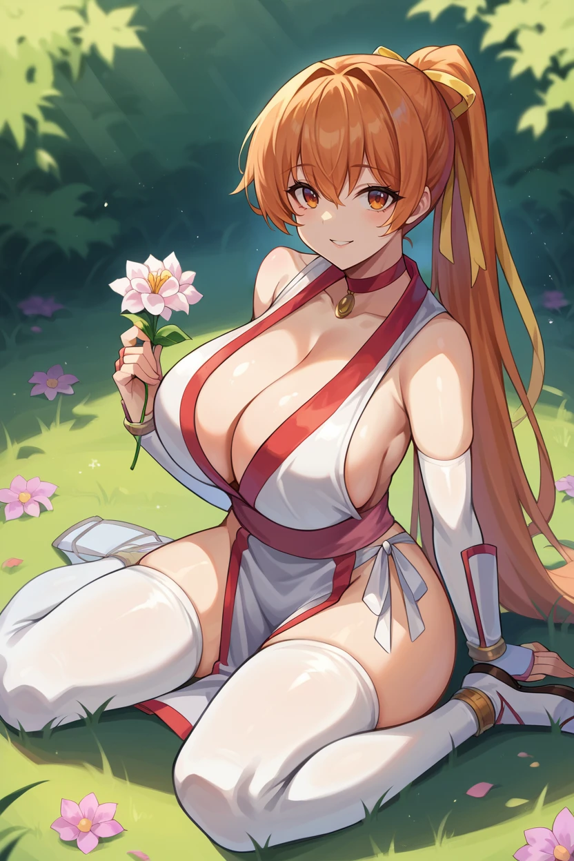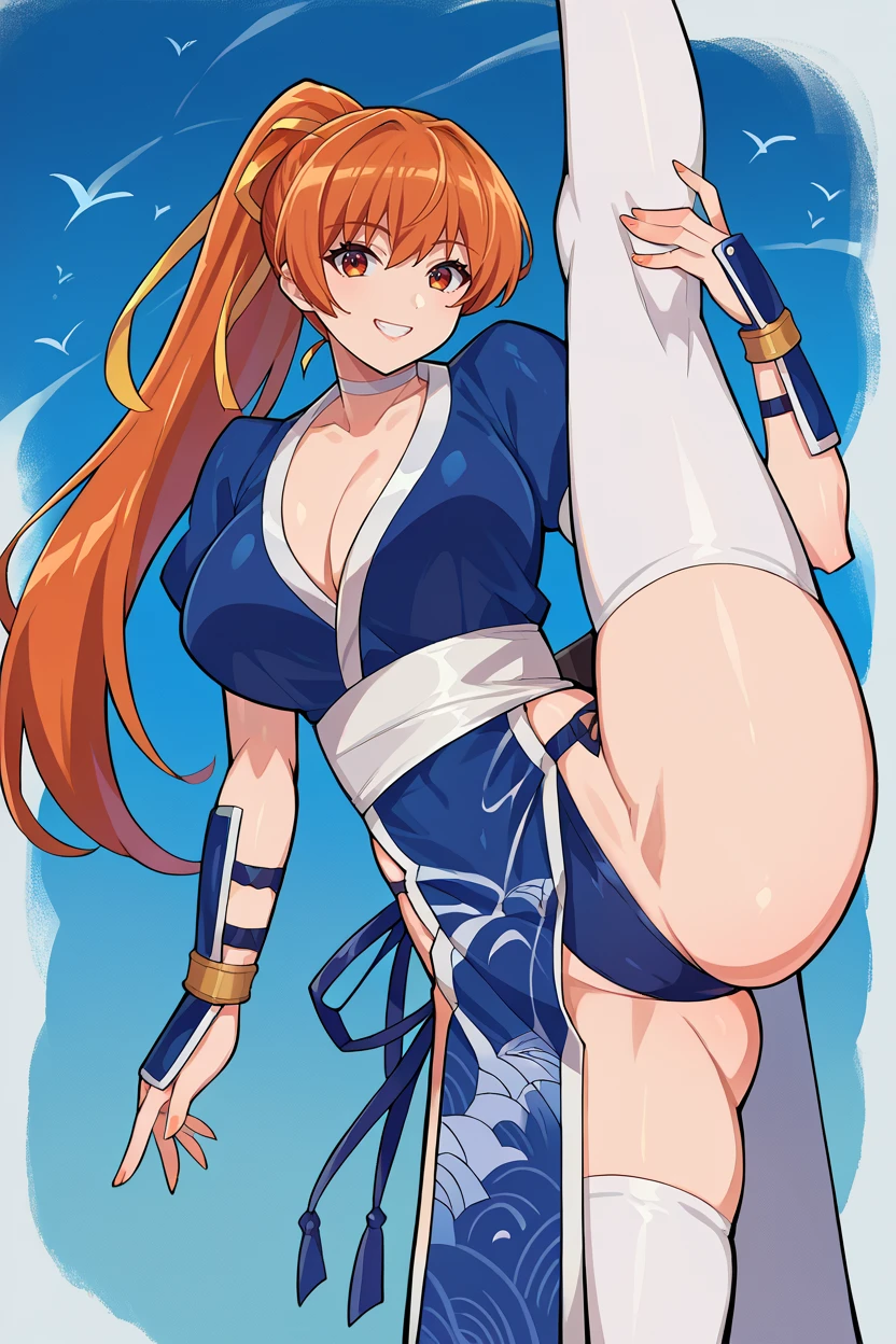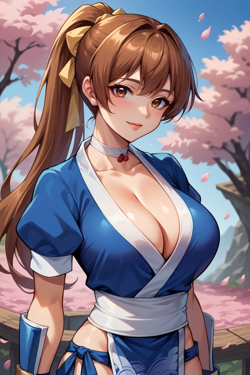 Add "ponytail, hair ribbon, choker, blue dress, short sleeves, sash, japanese clothes, cleavage, arm guards, pelvic curtain, white thighhighs" for her typical look.