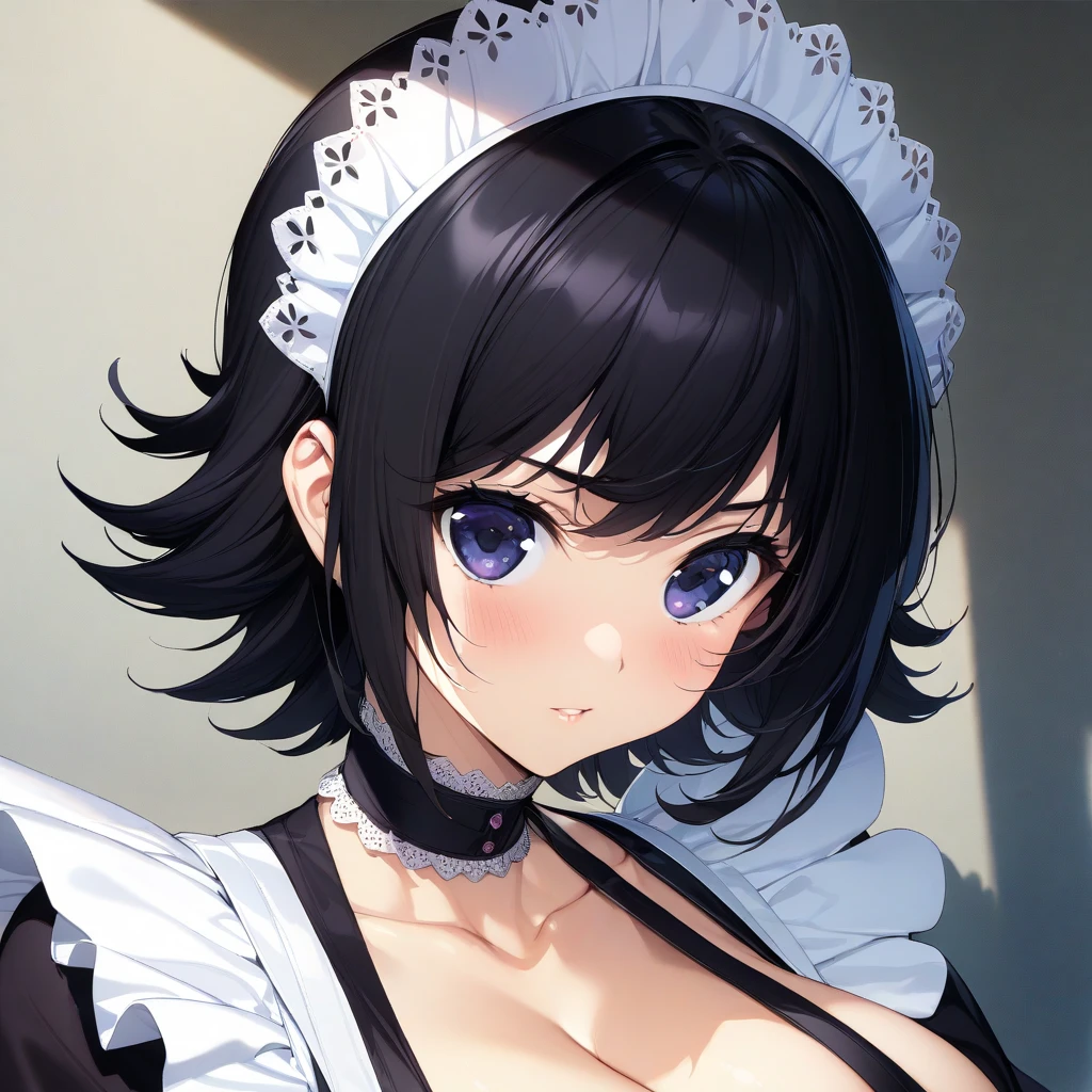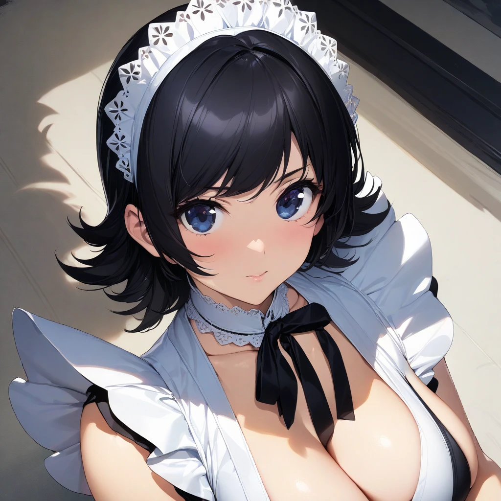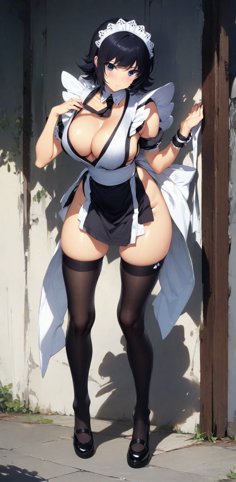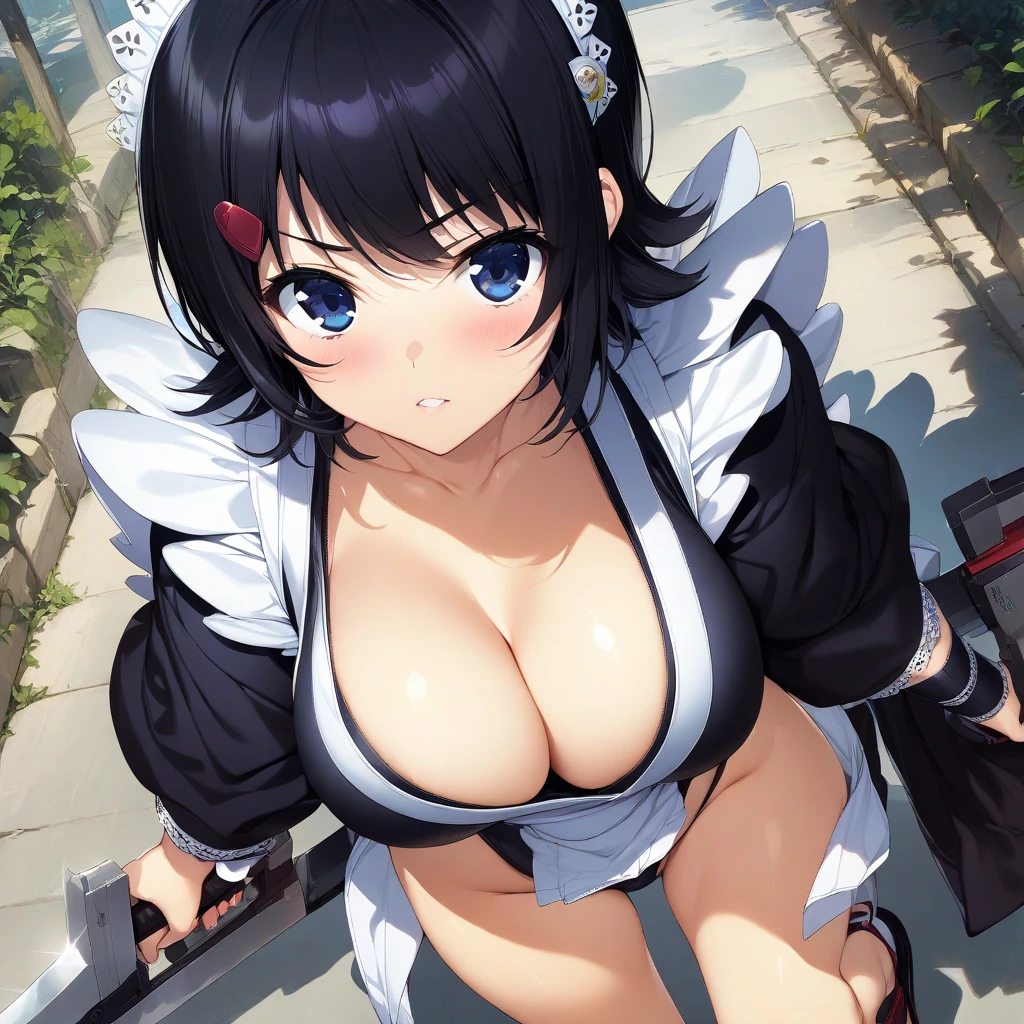 thighhighs, black hair, cleavage, weapon, large breasts, short hair, flipped hair, maid, maid headdress