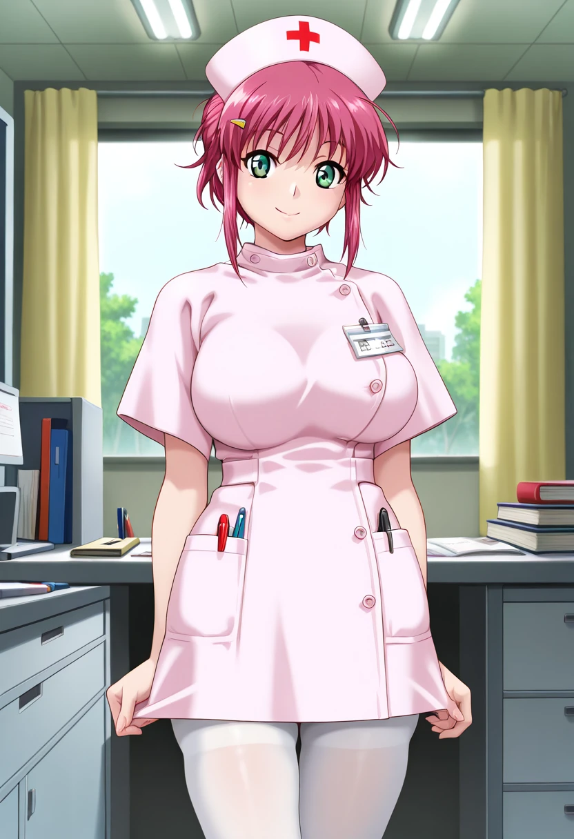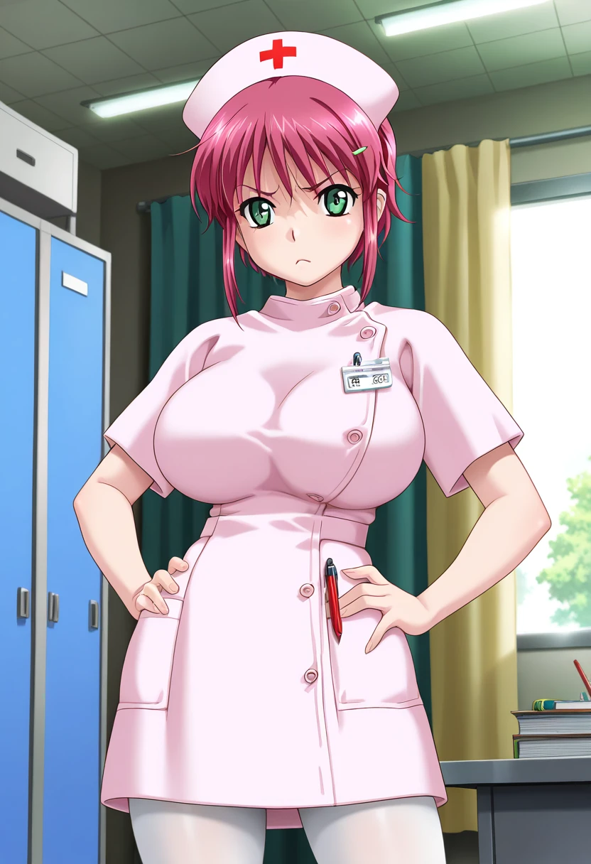 nurse, nurse cap, pink short dress, short sleeves, white pantyhose, pen, name tag,