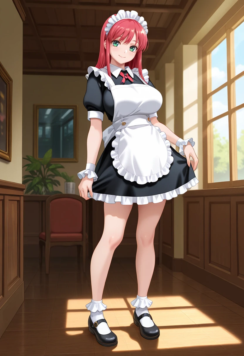 maid, maid headdress, frilled dress, short sleeves, wrist cuffs, maid apron, white bobby socks, black mary janes,