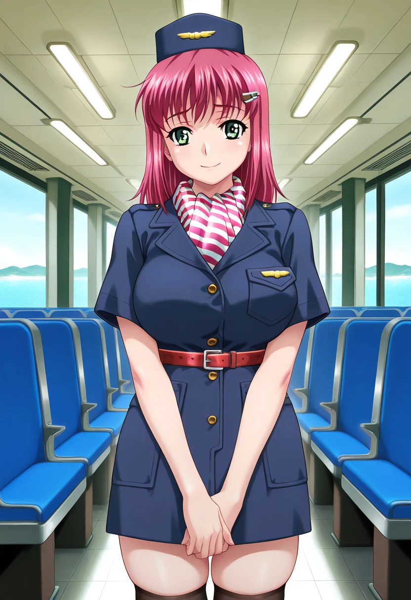 travel attendant, uniform, hat, striped scarf, dark blue dress, short sleeves, red belt,