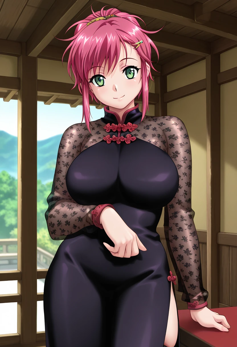 naoww, green eyes, pink hair, short hair, folded ponytail, barrette, hairpin, sidelocks, large breasts,