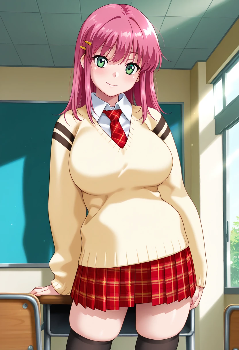 school uniform, red plaid necktie, yellow sweater, white collared shirt, long sleeves, plaid skirt, red pleated skirt, black kneehighs,